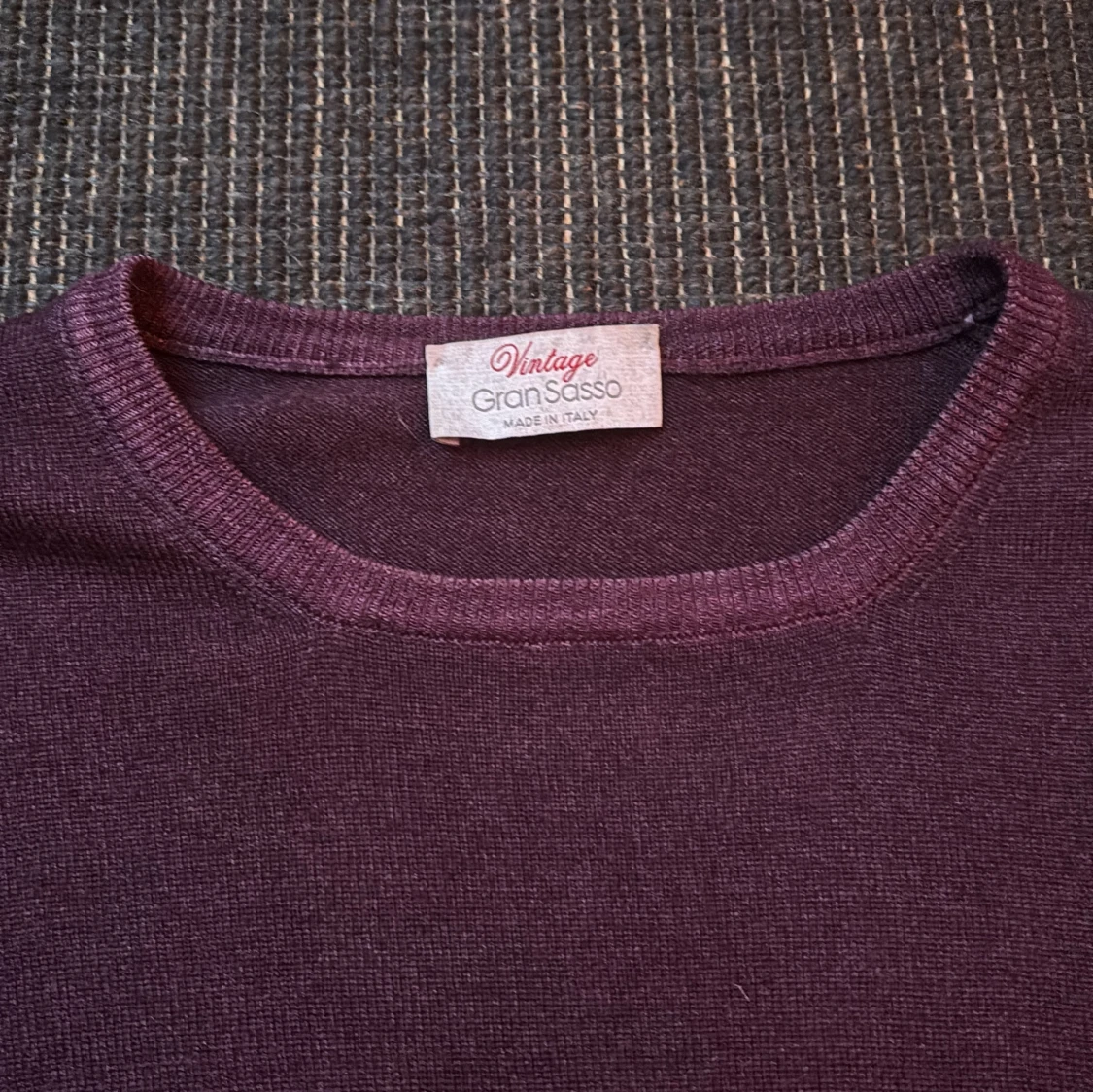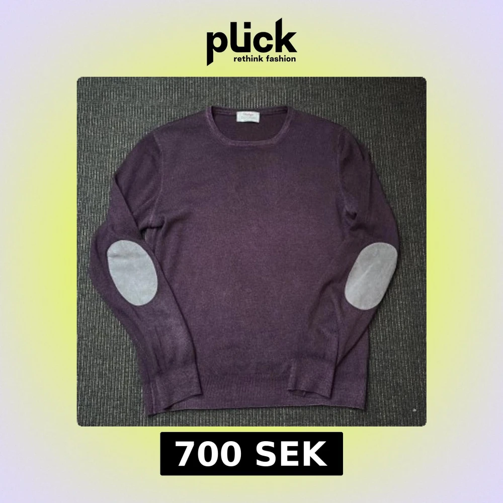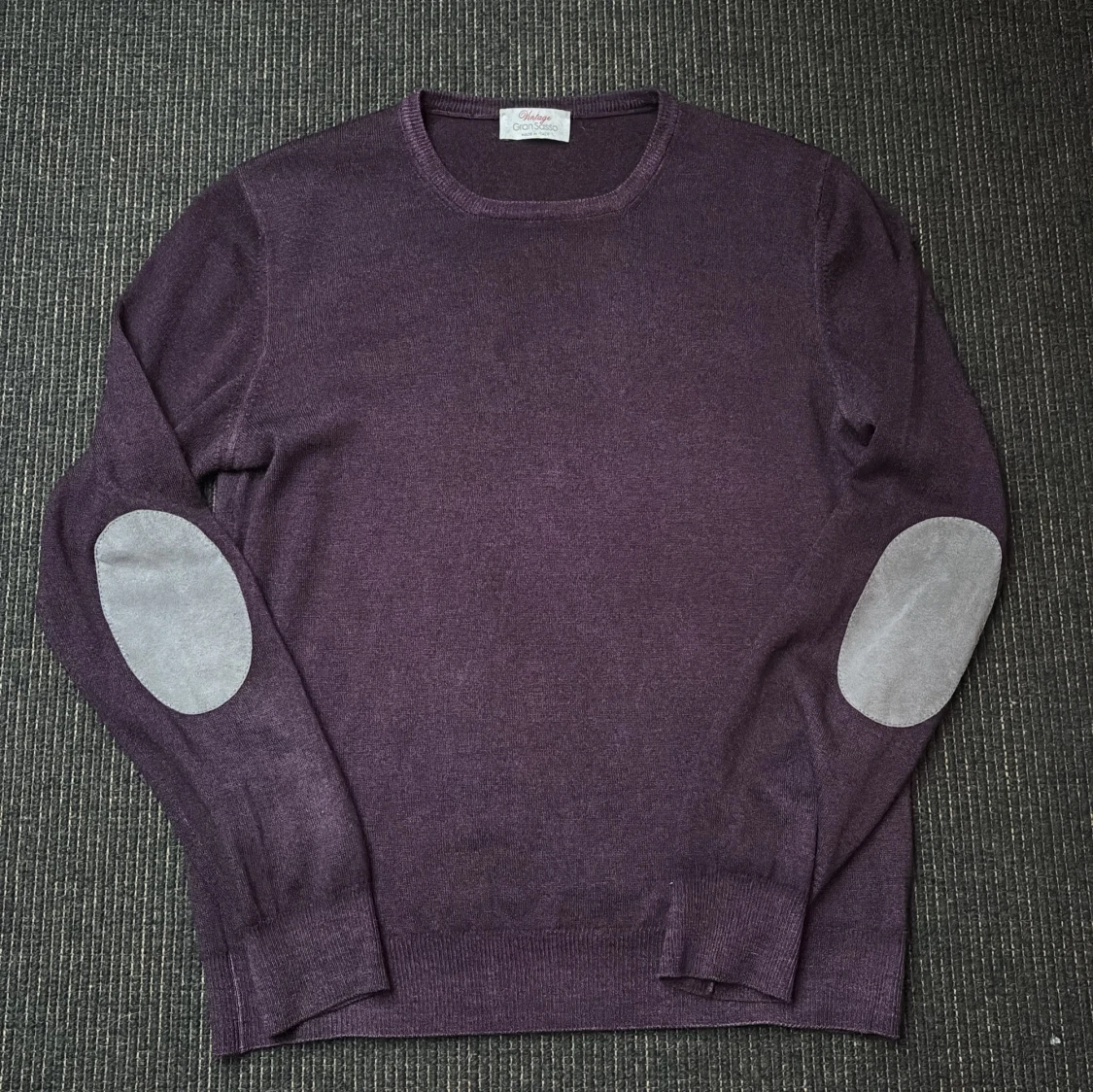 Säljer en stilren kashmir, lila tröja i storlek m från Gran Sasso med rund hals och kontrasterande armbågslappar i grått. Perfekt för en elegant outfit! Tillverkad i Italien.