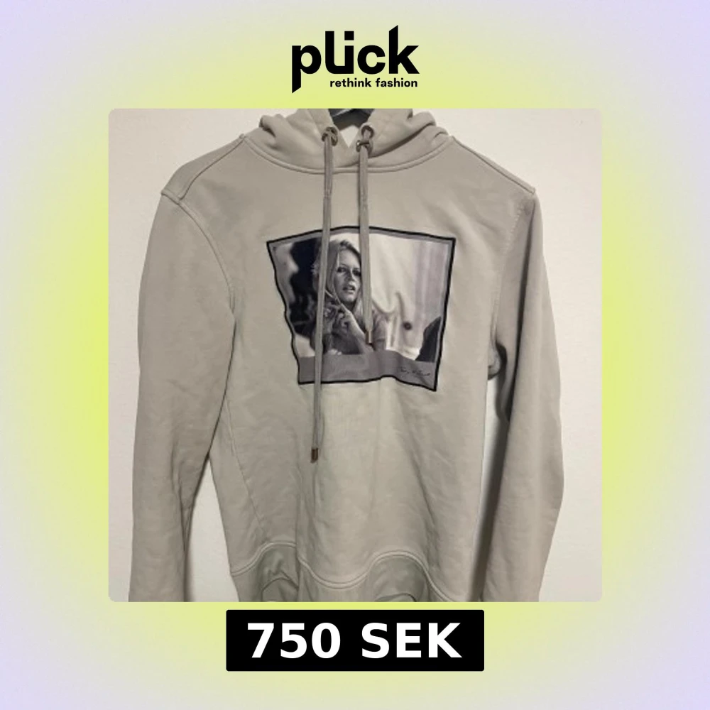 Säljer en beige hoodie från Limitato med en tryckt bild av Brigitte Bardot på framsidan. Hoodien har en klassisk design med dragsko i huvan och långa ärmar. Perfekt för en stilren och bekväm look.
