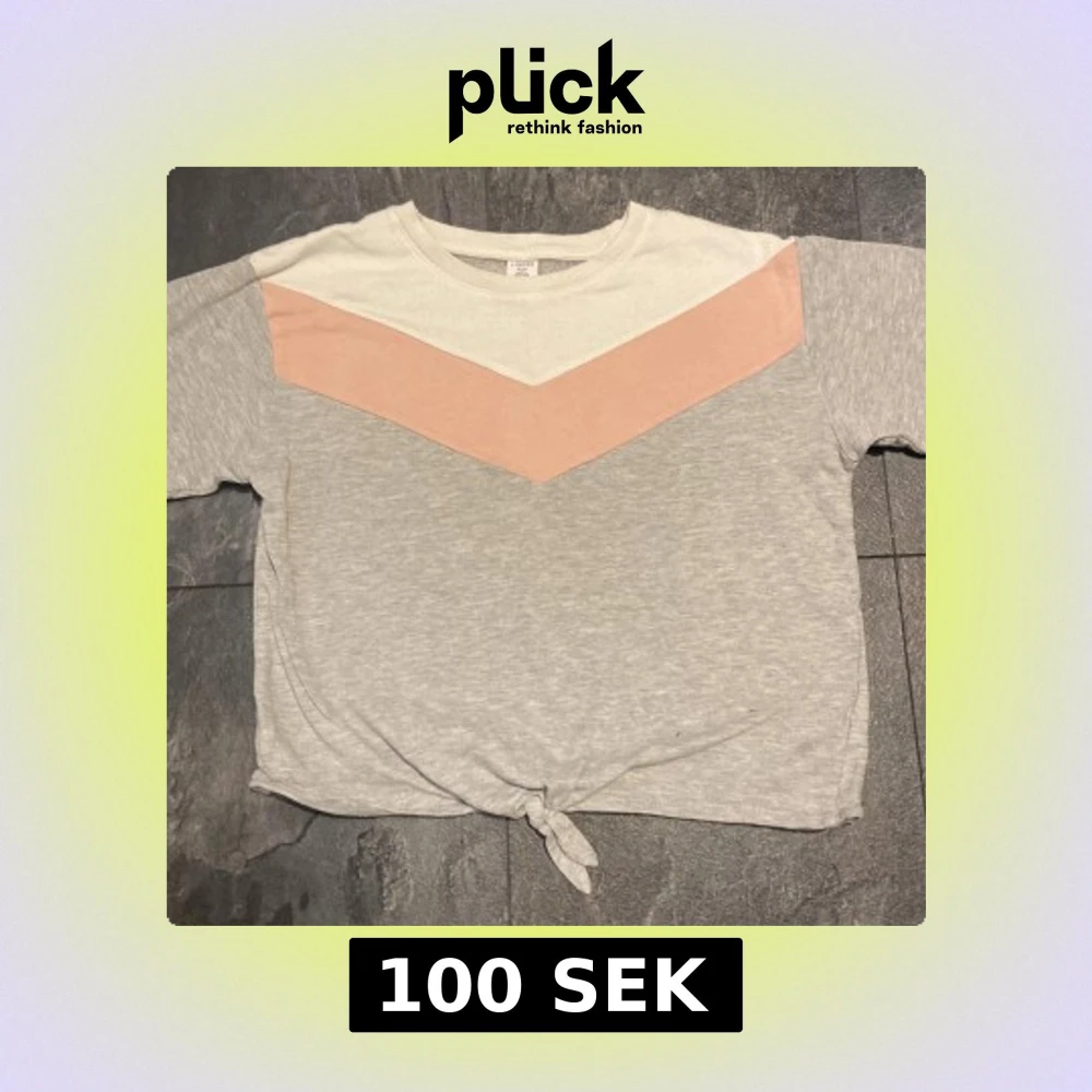 Säljer en grå långärmad tröja från Lindex med vitt och ljusrosa V-format mönster upptill. Tröjan har en knytning nertill som ger en snygg detalj. Perfekt för en avslappnad och trendig stil.