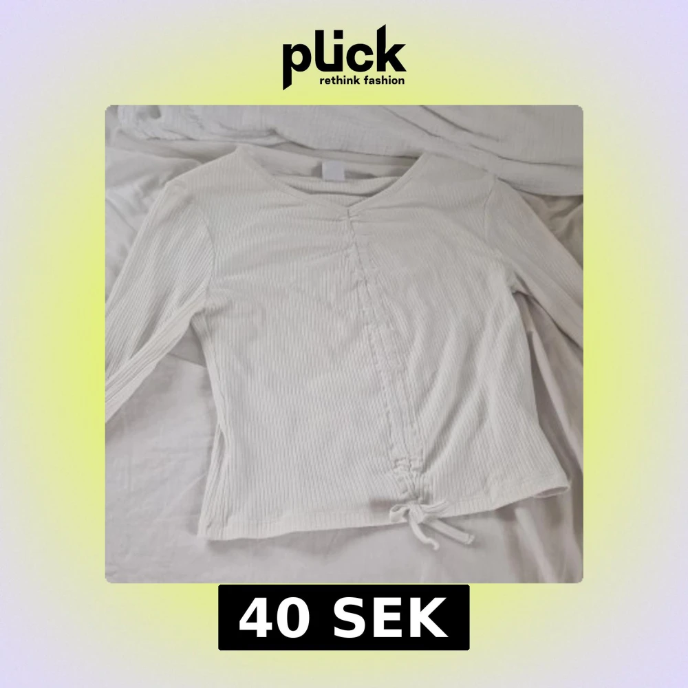 Säljer en vit ribbad långärmad topp med v-ringning och knyt framtill. Toppen har en lätt croppad passform och är perfekt för en stilren vardagslook.