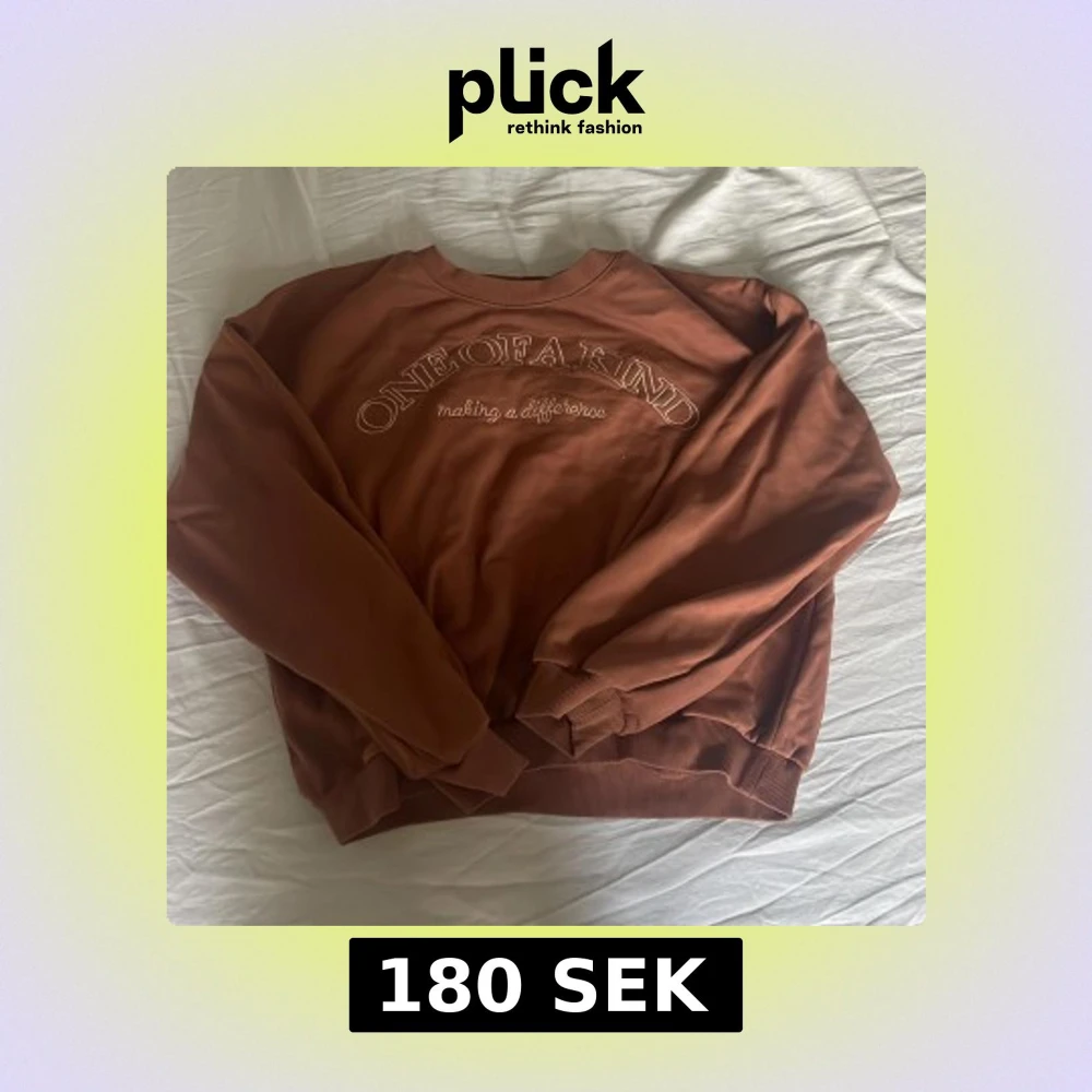 Säljer en brun sweatshirt från Lindex med broderad text 'ONE OF A KIND making a difference' på bröstet. Tröjan har rund hals, ribbade muddar och är långärmad. Perfekt för dig som gillar chill och enkel stil.