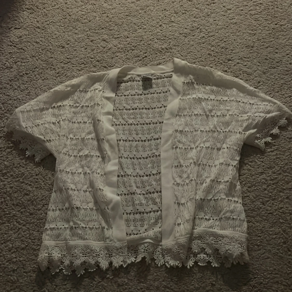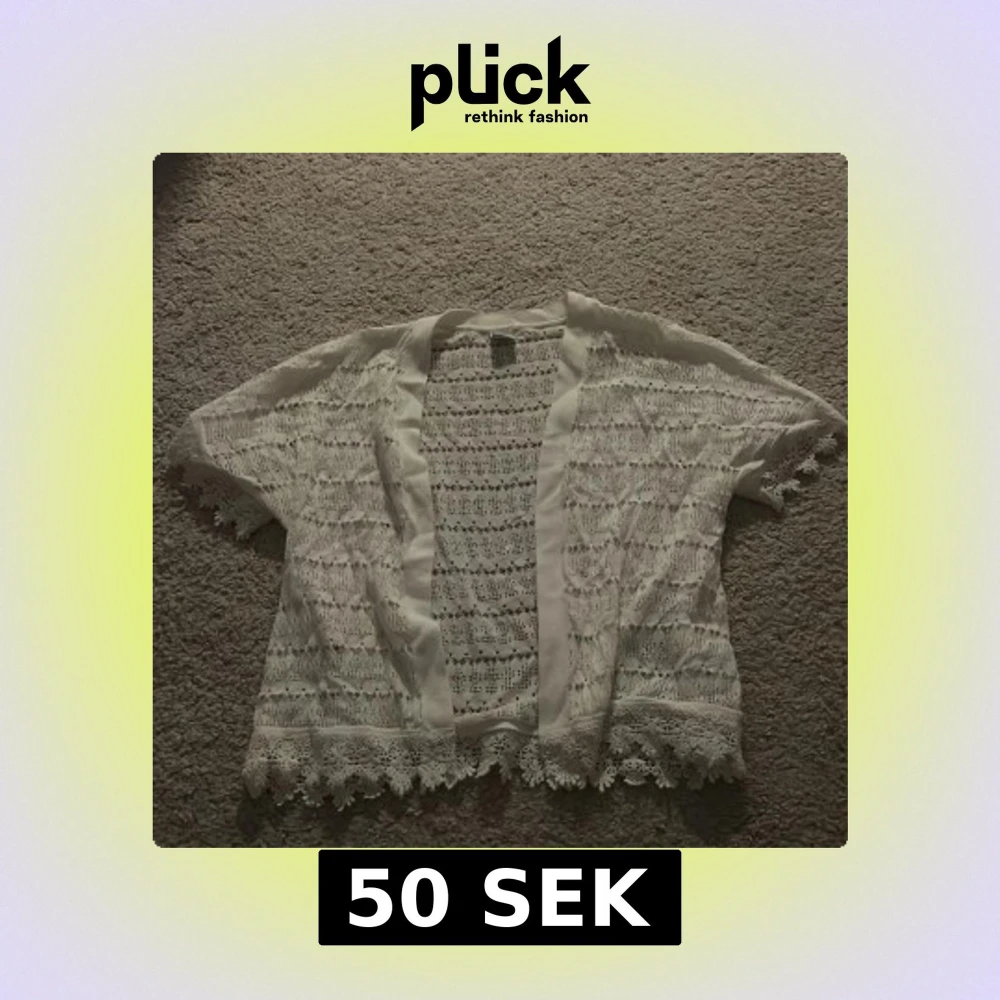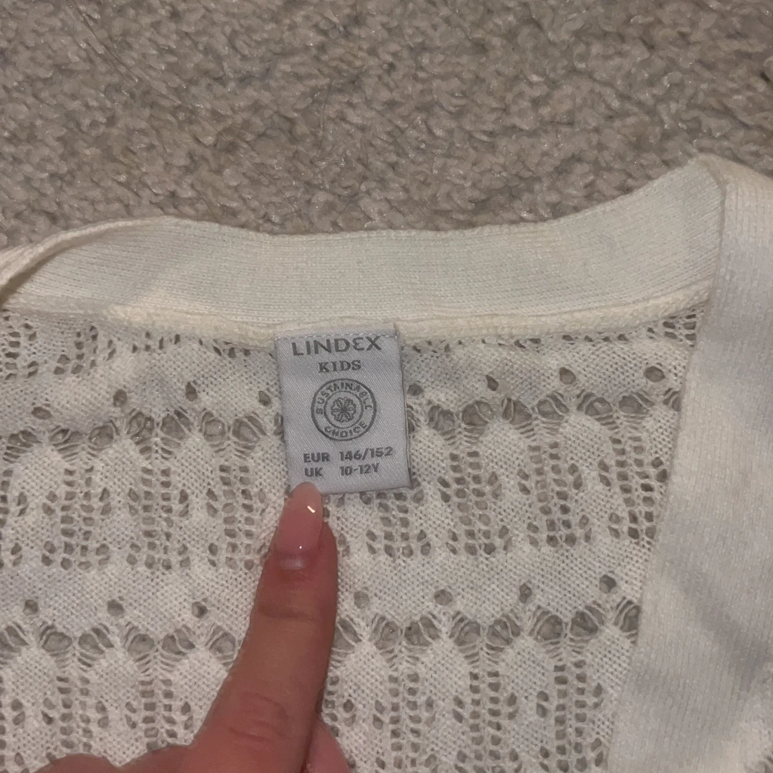 Söt vit kofta från Lindex med korta ärmar och vackra spetsdetaljer. Koftan är öppen framtill och har fina virkade mönster. Perfekt att slänga över en topp för en extra touch.
