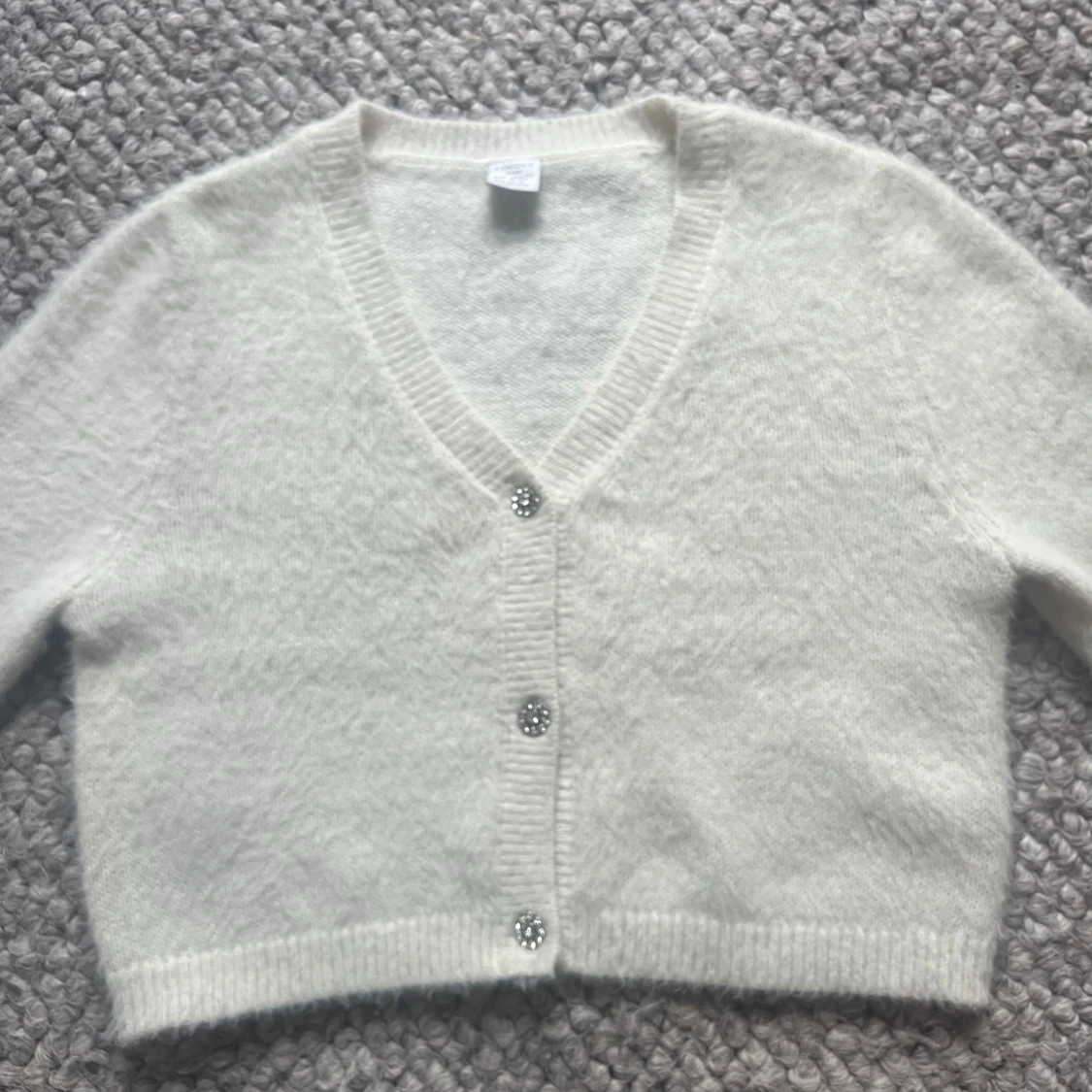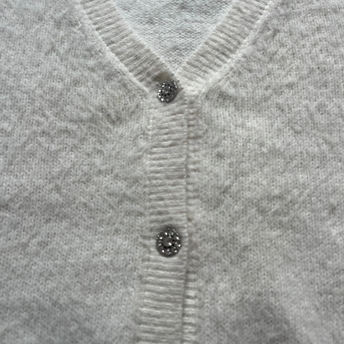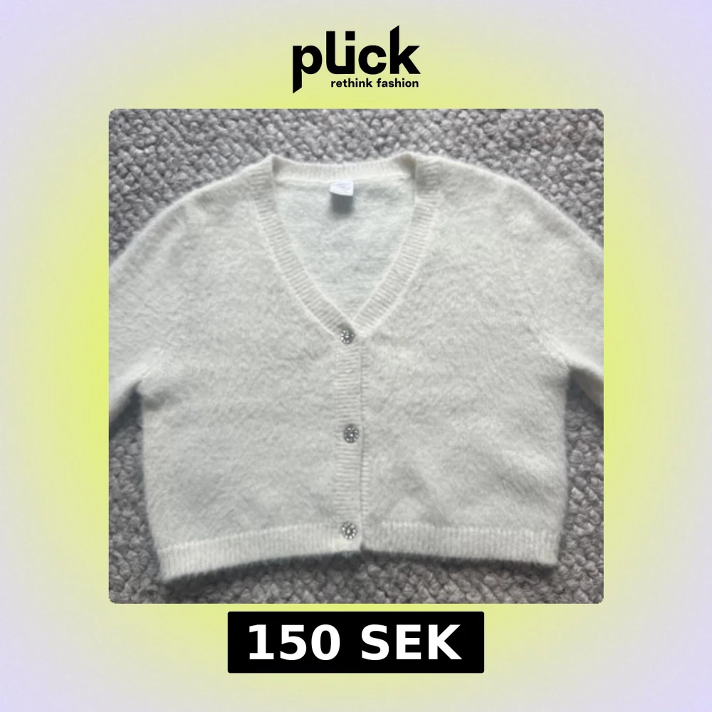 Säljer en söt vit kofta från Lindex i storlek 146/152. Koftan har en v-ringning med glittriga knappar framtill. Den är mjuk och bekväm!💕