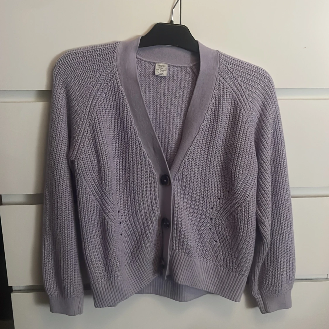 Säljer en mysig lila stickad kofta från Lindex. Koftan har en v-ringad design med knappar framtill och ribbade muddar. Perfekt för kyliga dagar! Den har dock ett litet håll där bak, som nu ser på bilden.🥰