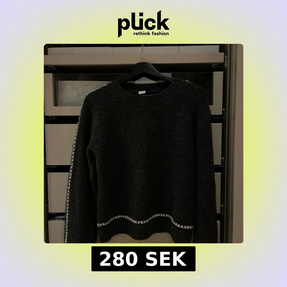 Säljer en mysig mörkgrå stickad tröja med vita mönster längs ärmarna och nederkanten. Perfekt för kyliga dagar och ger en stilren look. Tröjan har långa ärmar och en rund halsringning.