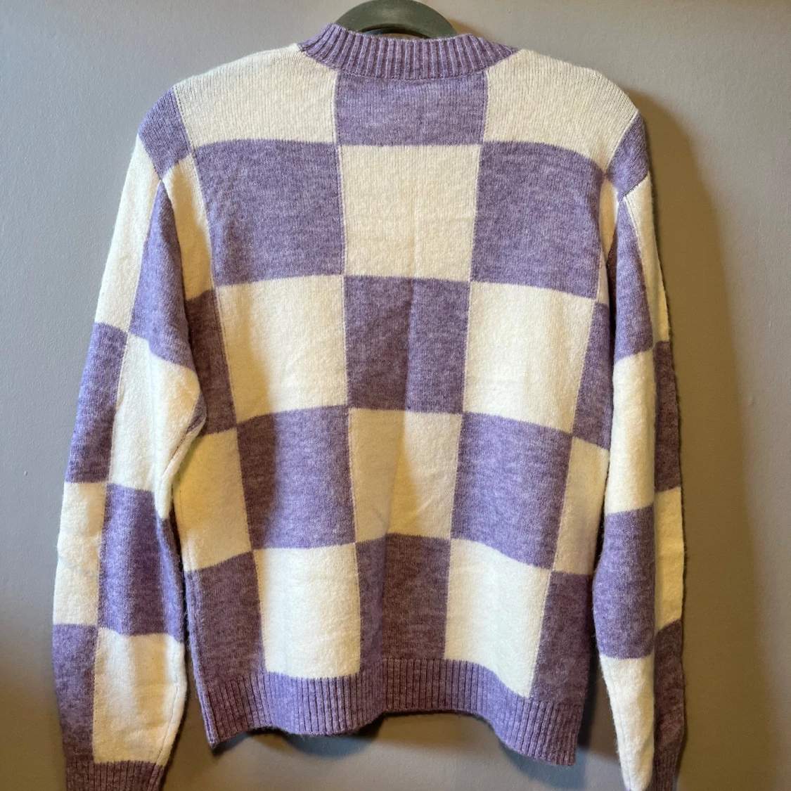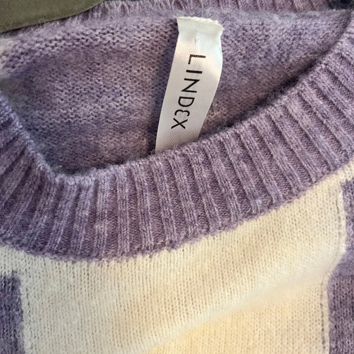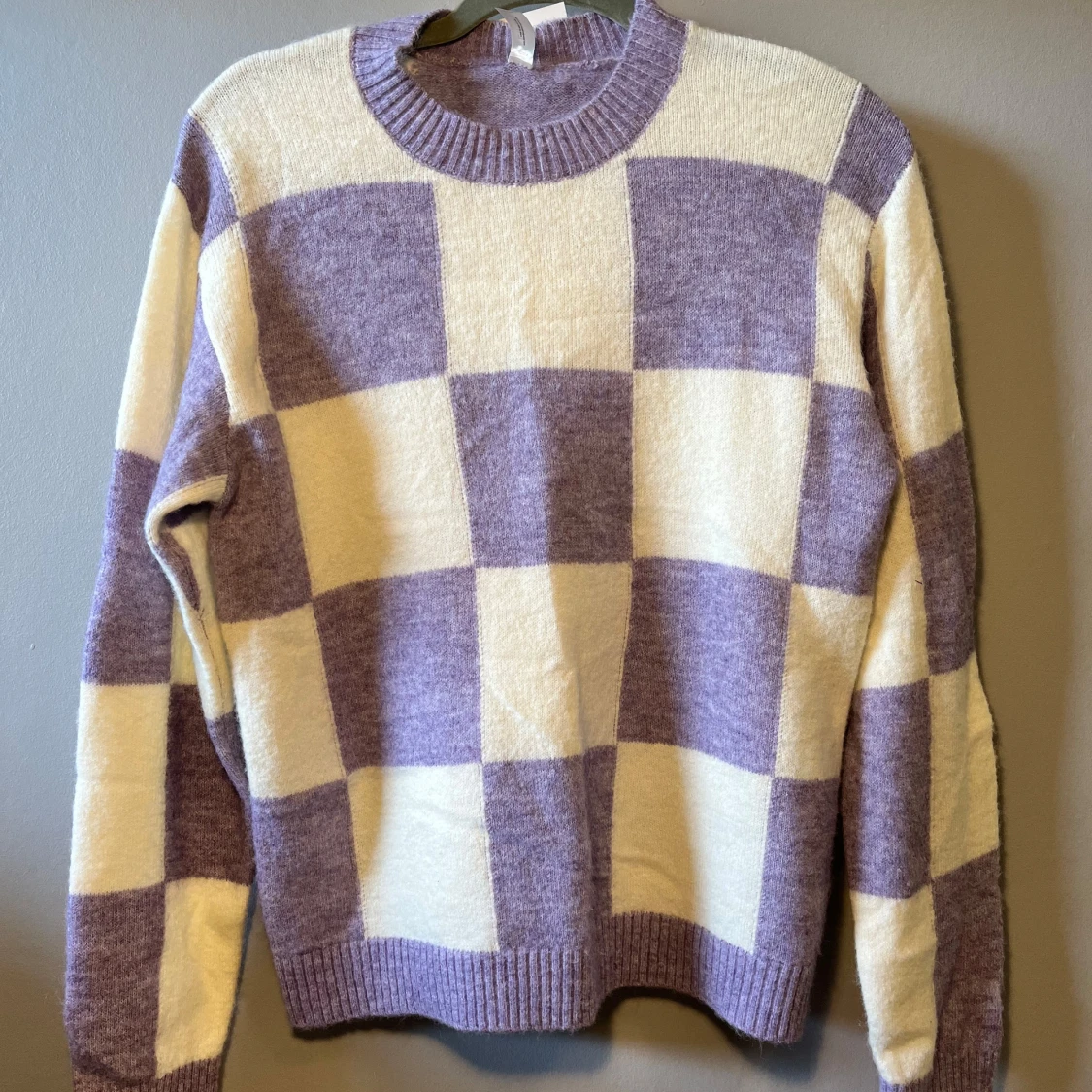 Supermysig stickad tröja från Lindex i lila och vitt med rutigt mönster. Tröjan har rund halsringning, ribbade muddar och lång ärm. Perfekt för dig som gillar en chill och trendig vibe.