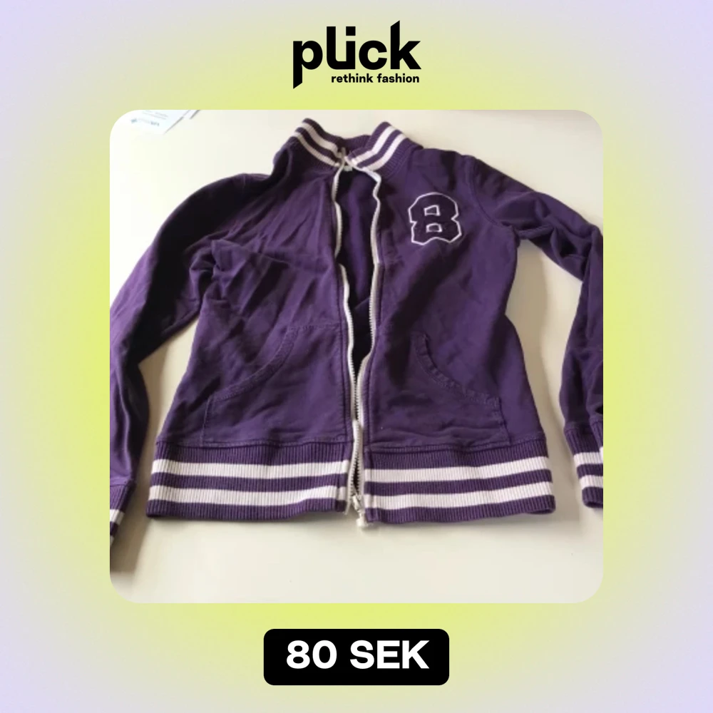 En lila tröja med vit dragkedja och med ficka. Lite ”sportig” stil