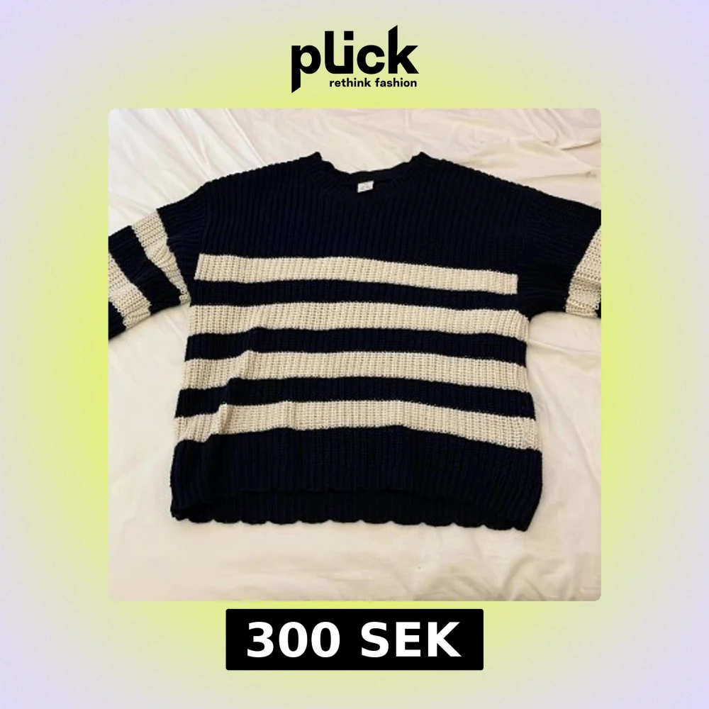 Säljer en stickad tröja med breda marinblå och vita ränder från lindex. Pris kan diskuteras
