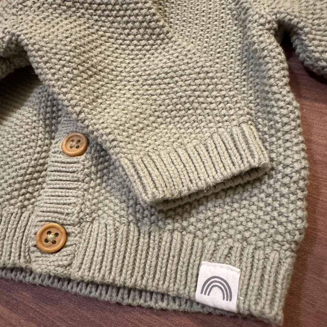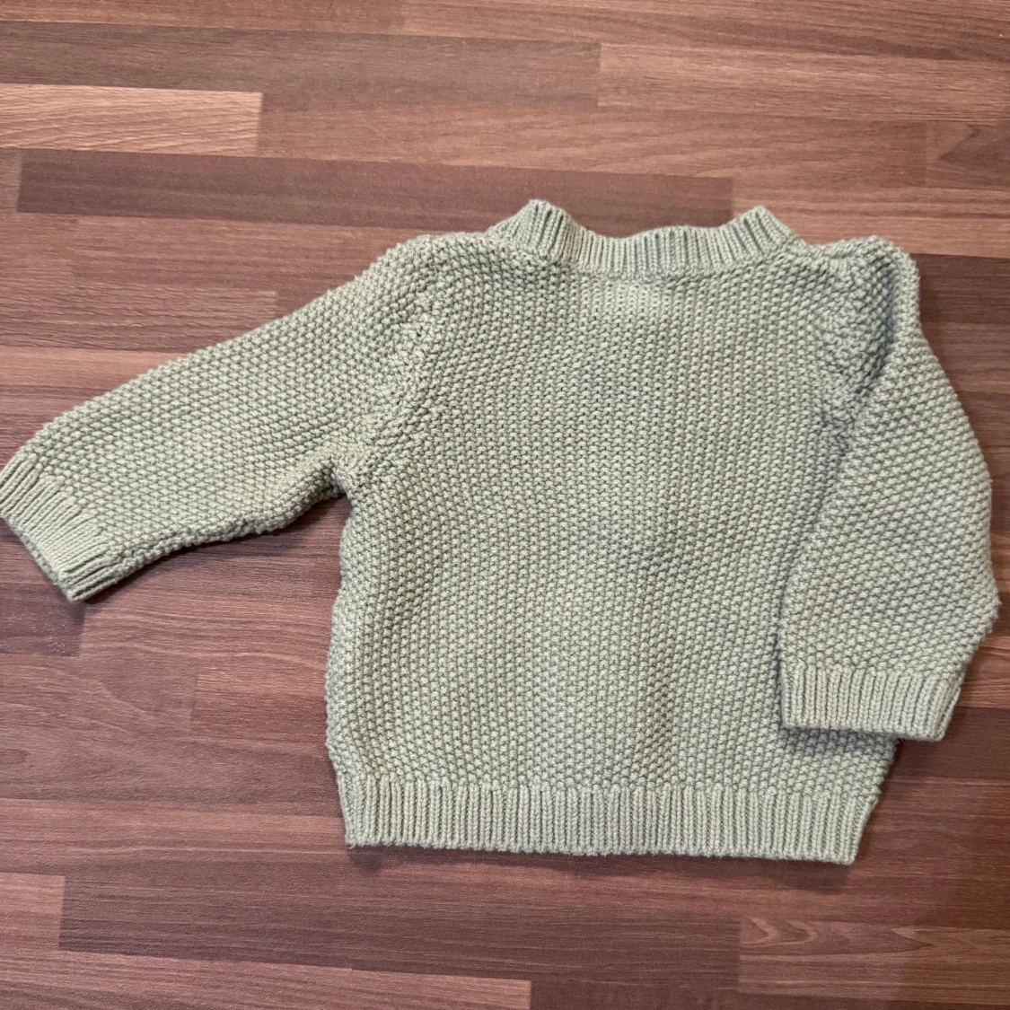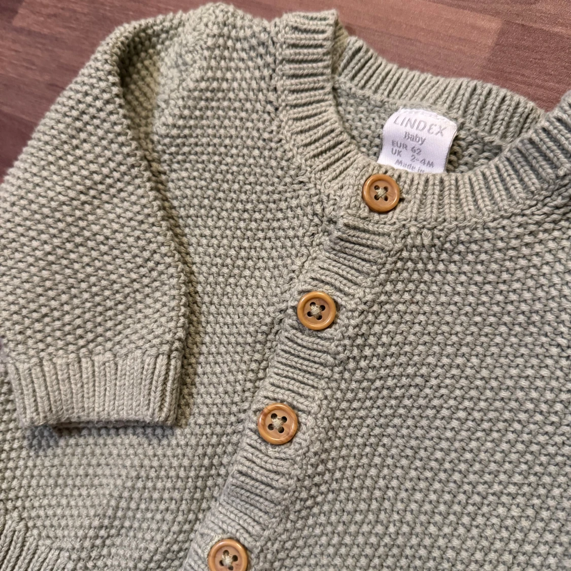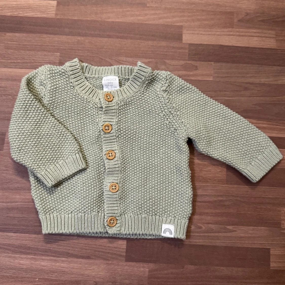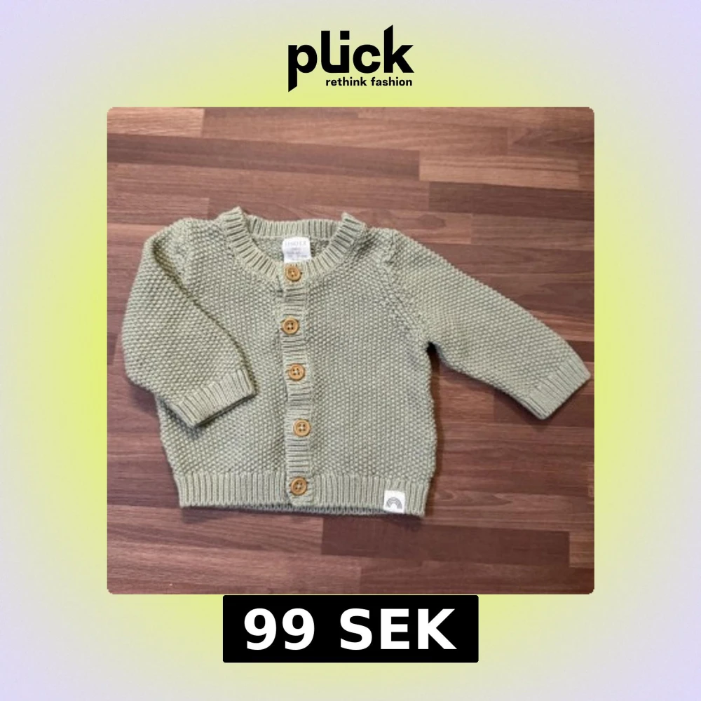 Oanvänd, endast upptvättad. Superfin stickad kofta från Lindex i ljusgrön nyans. Stl 62 (2-4mån). Finns träknappar framtill och ribbade muddar. Perfekt för lager på lager under kyliga dagar.