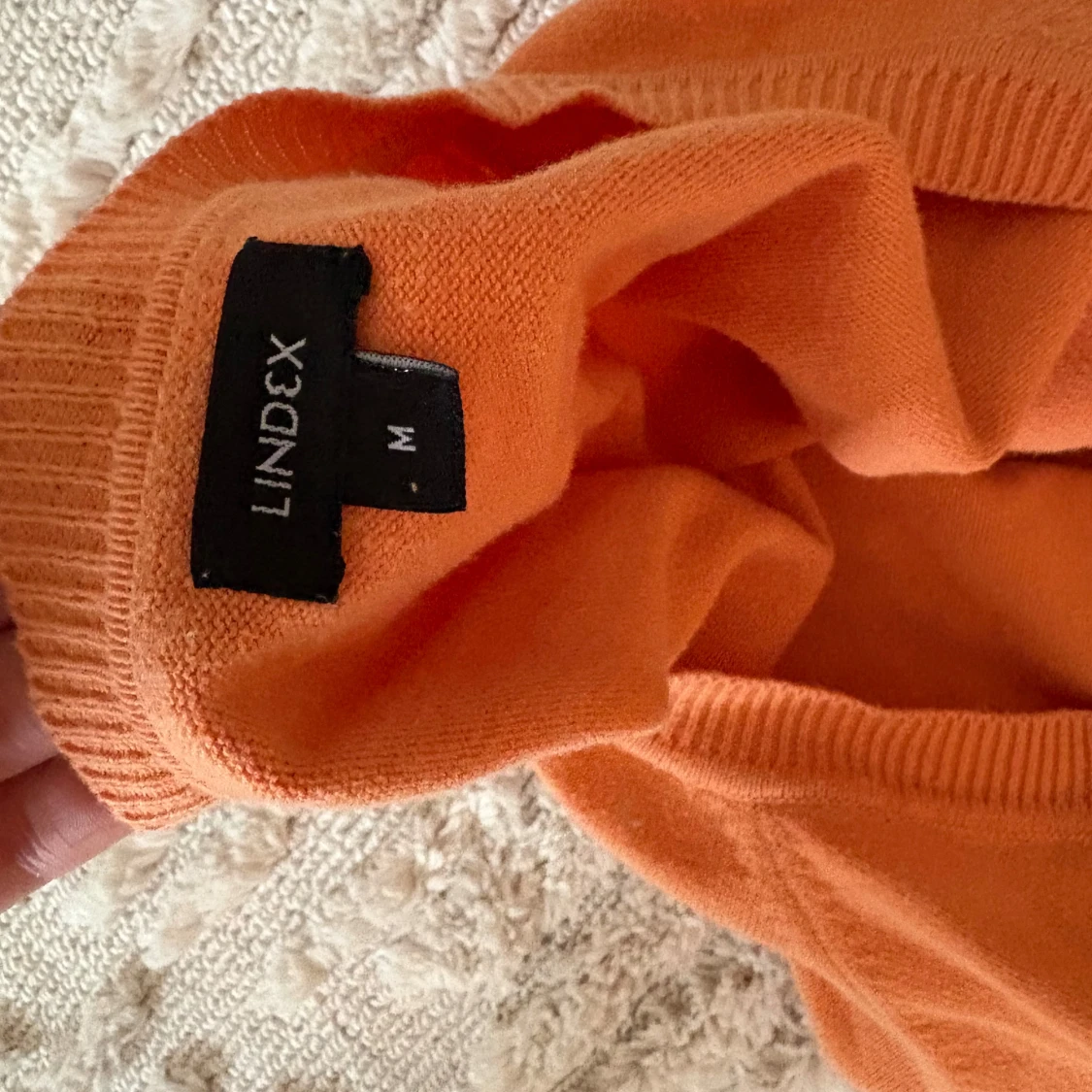 Säljer en orange v-ringad tröja från Lindex i mjukt material. Tröjan har långa ärmar och ribbade muddar vid ärmslut och nederkant. Perfekt för lager-på-lager och enkel att matcha med olika outfits.