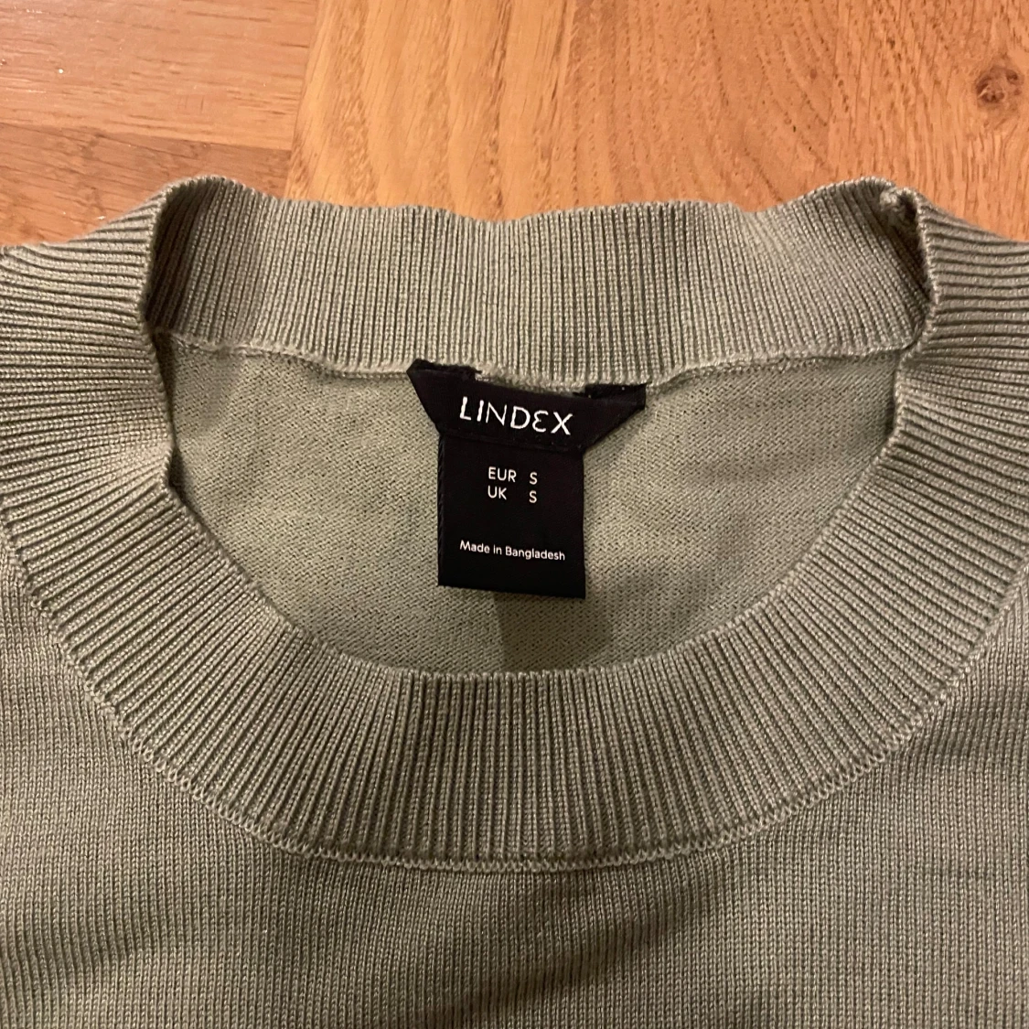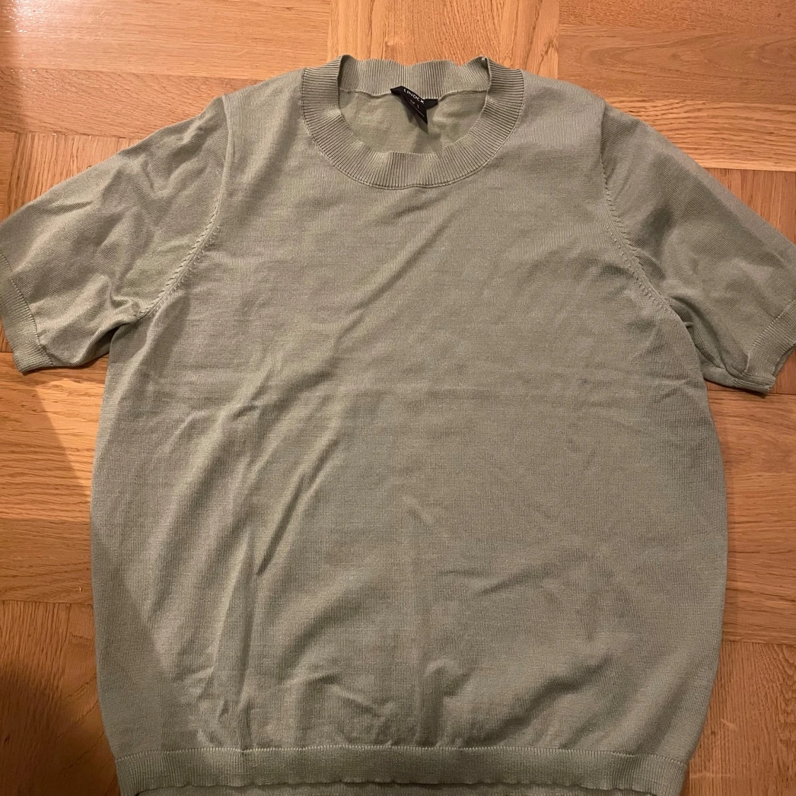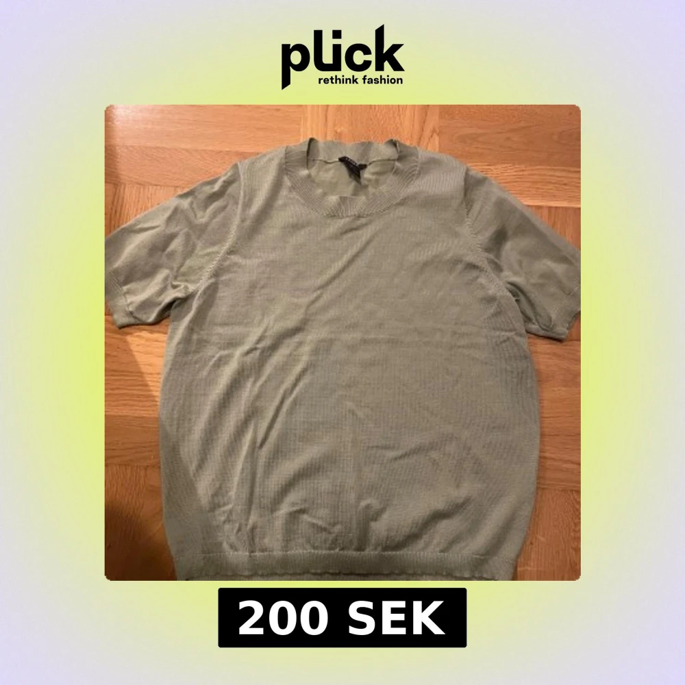 Säljer en ljusgrön stickad tröja från Lindex med korta ärmar och rund halsringning. Tröjan har ribbade muddar vid ärmslut, hals och nederkant. Perfekt för lager-på-lager eller sommarens svalare dagar.