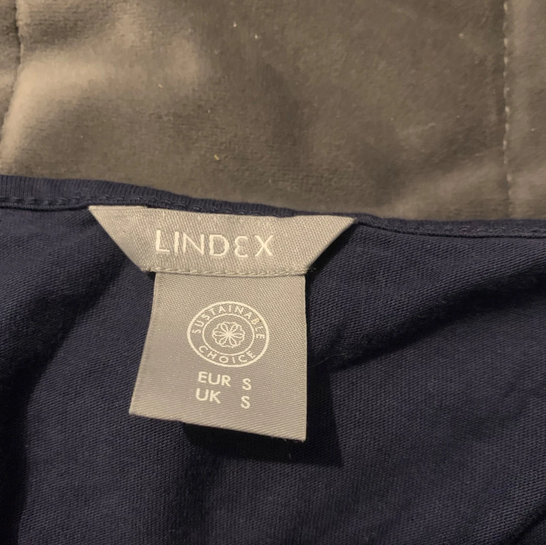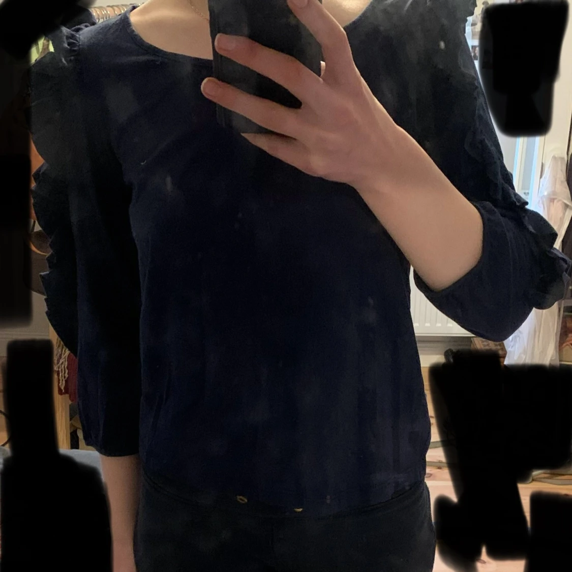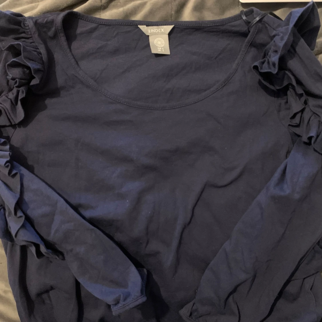 Säljer en mörkblå topp från Lindex med volangdetaljer längs ärmarna. Toppen har en rund halsringning 💙