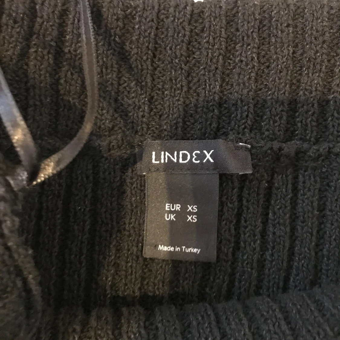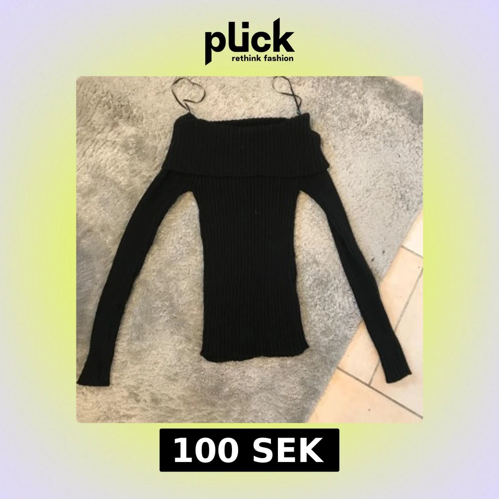 Säljer en svart ribbad offshoulder-tröja från Lindex i storlek XS. Tröjan har långa ärmar och smala axelband, perfekt för en trendig look. Materialet är stickat och sitter tight mot kroppen.