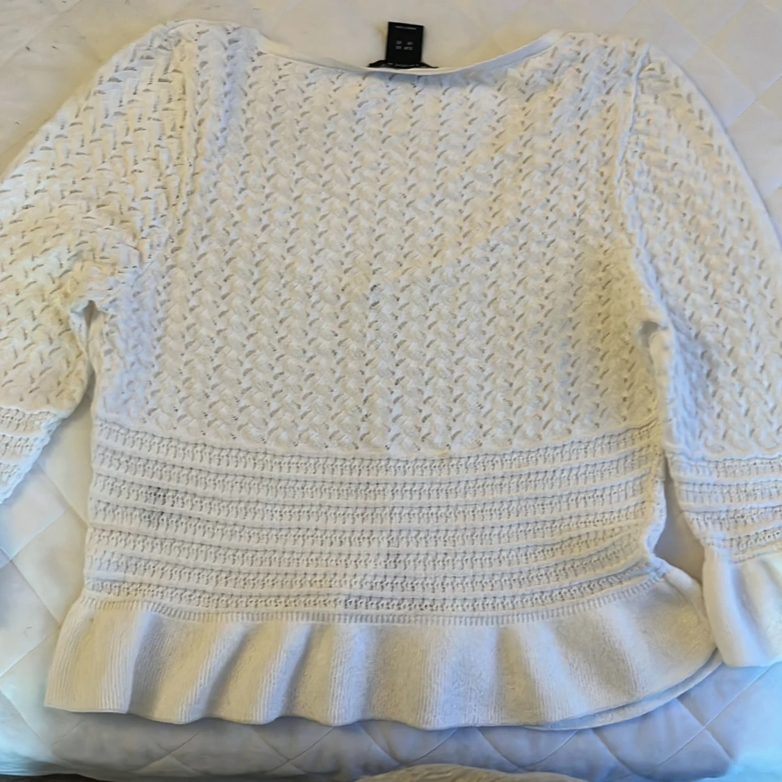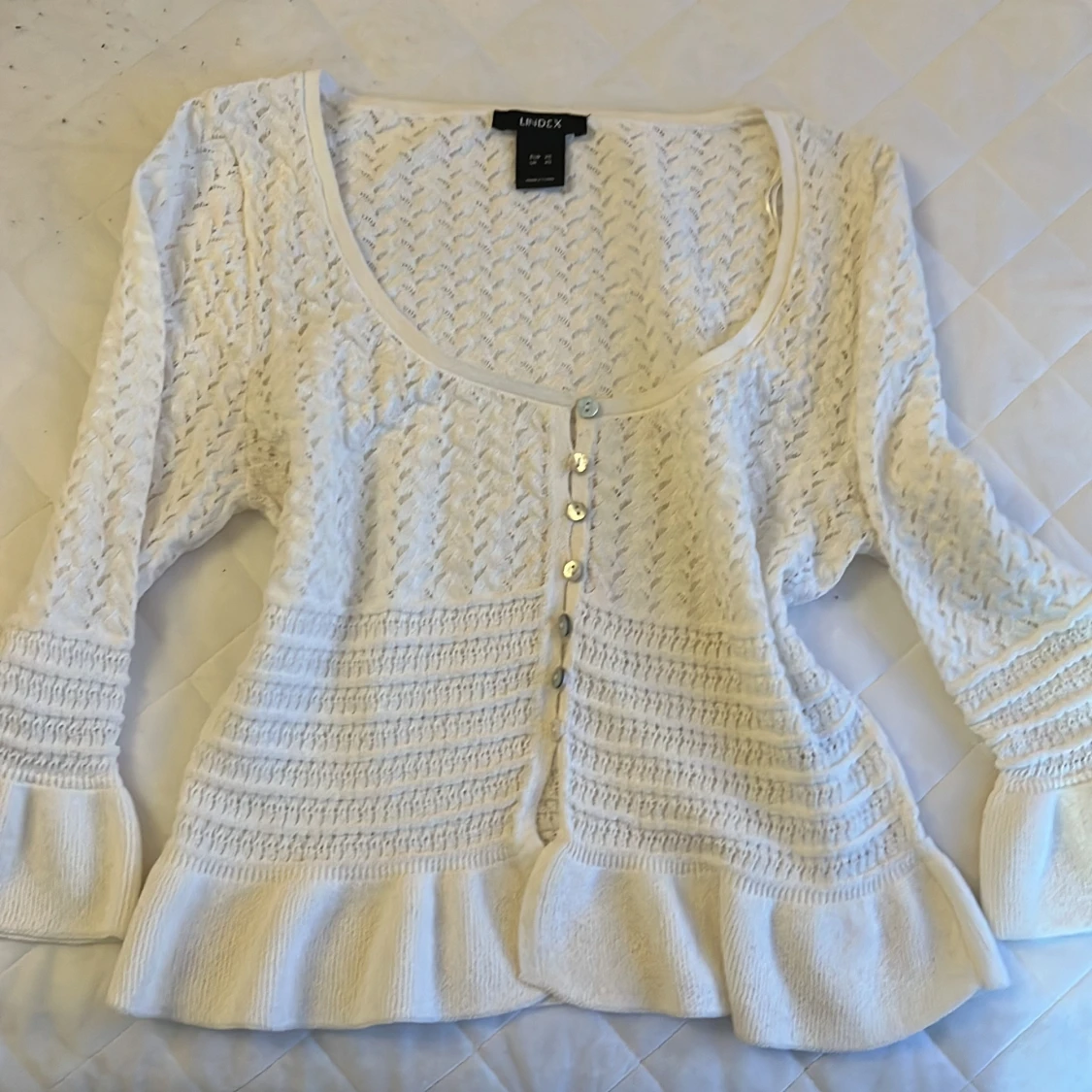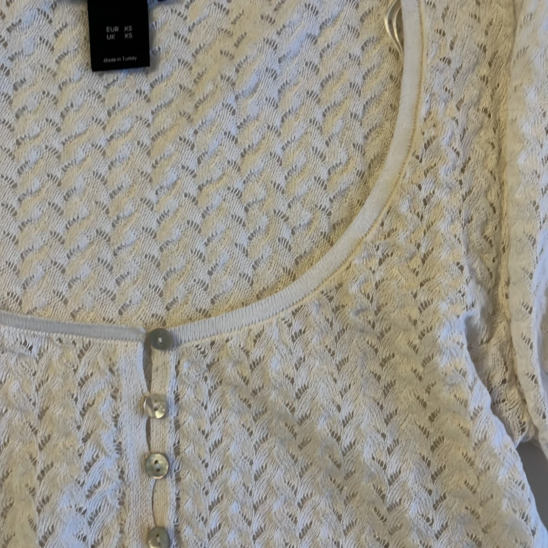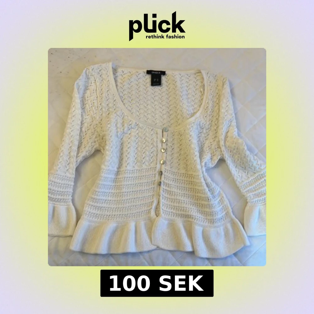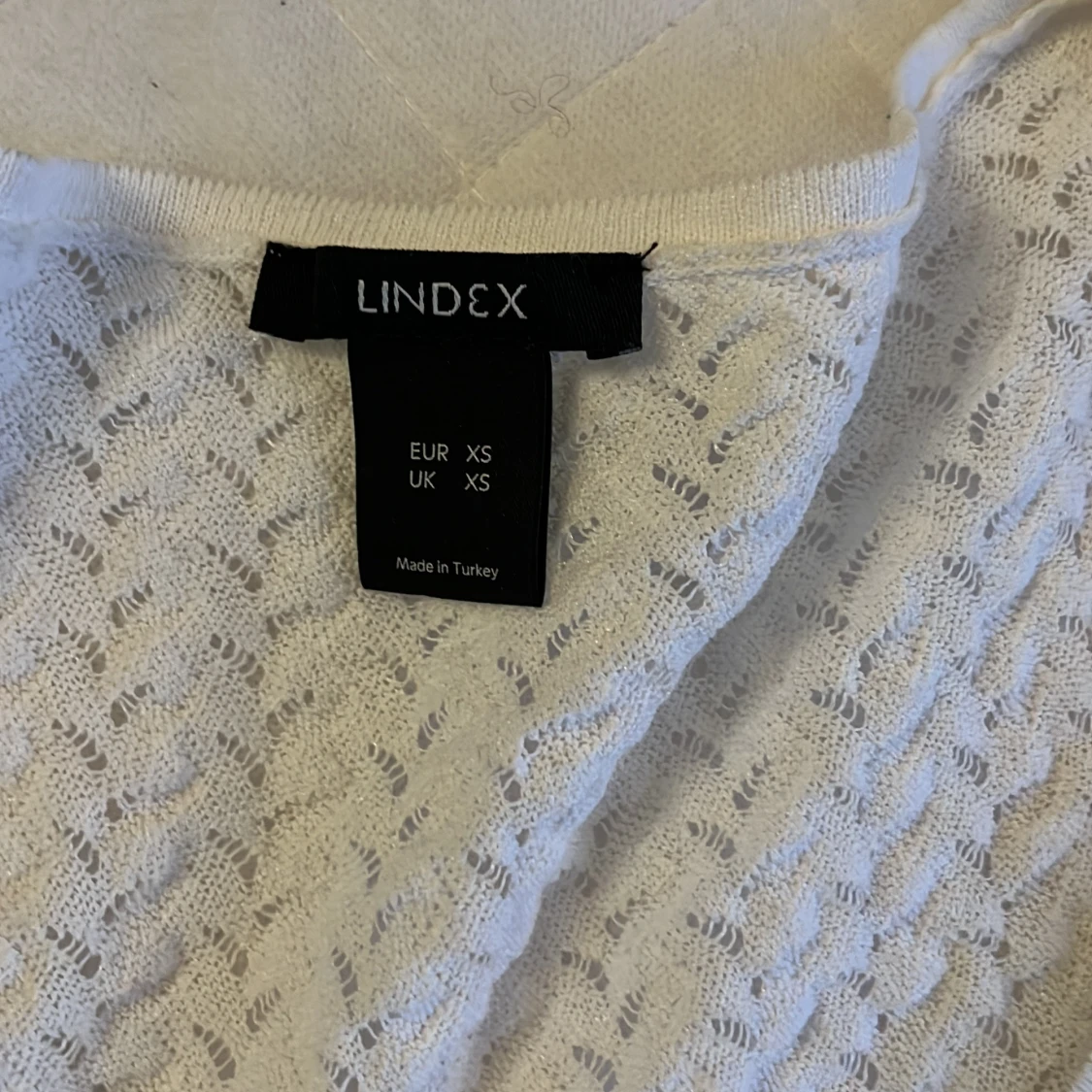 Säljer en söt vit stickad kofta från Lindex i storlek XS. Koftan har ett fint mönster och knappar framtill. Den har trekvartsärmar och en volangdetalj vid nederkanten. Perfekt för en stilren look!
