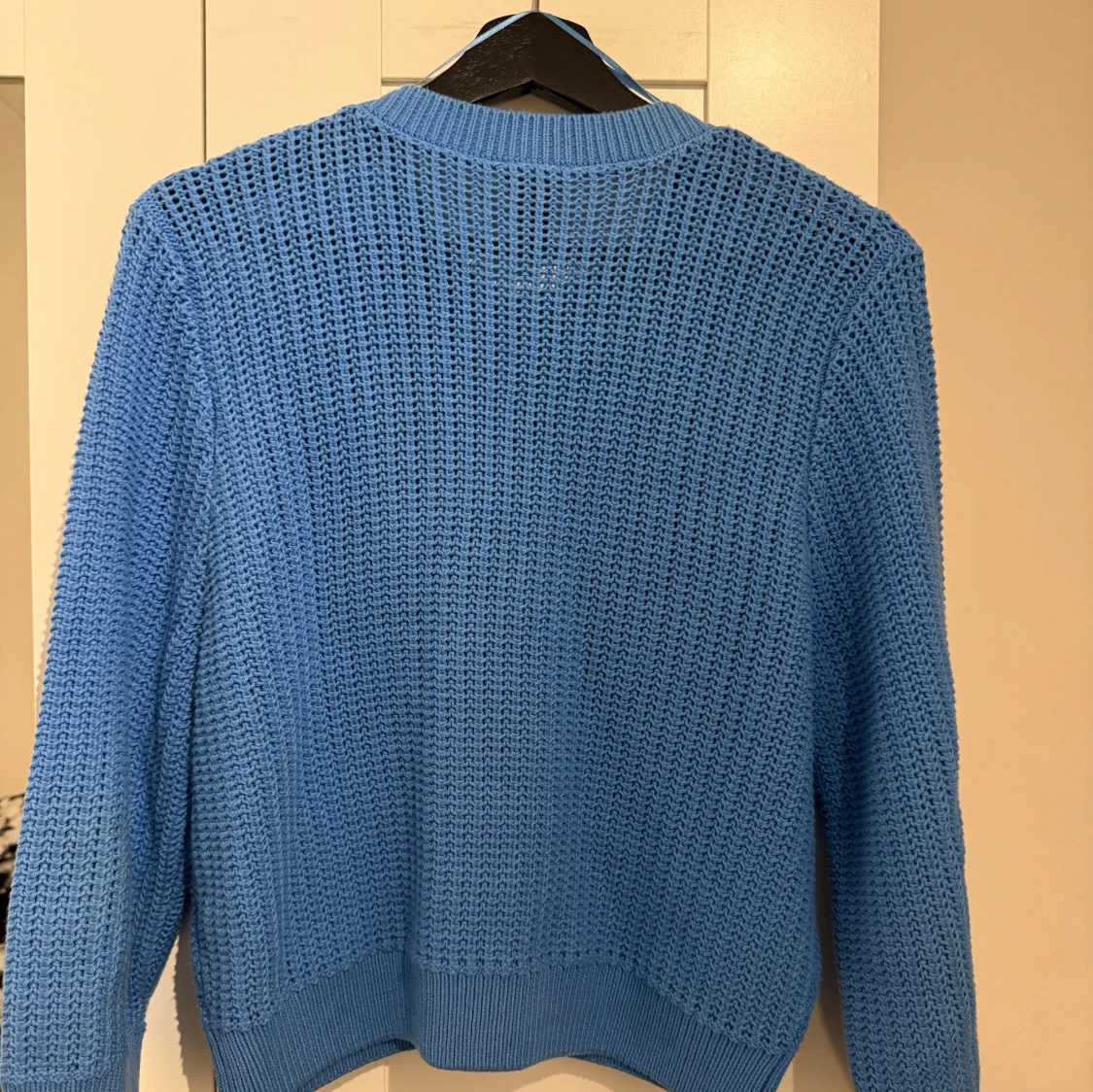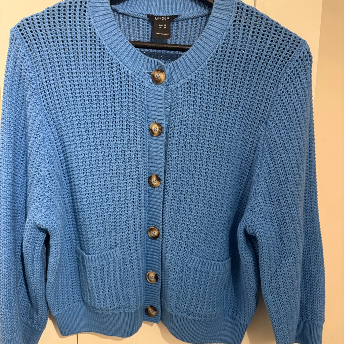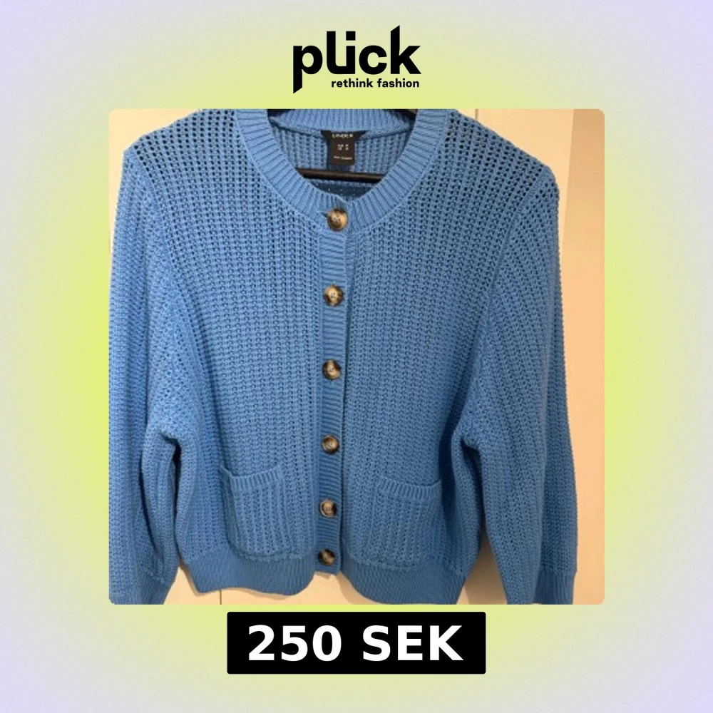 Säljer en blå stickad kofta från Lindex med snyggt hålmönster, ribbade muddar och två fickor framtill. Koftan har stora knappar och är långärmad.Den är använd några gånger men har inga defekter och är i mycket bra skick. Den har en superfin blå färg och passar perfekt till både hösten och vintern🩵