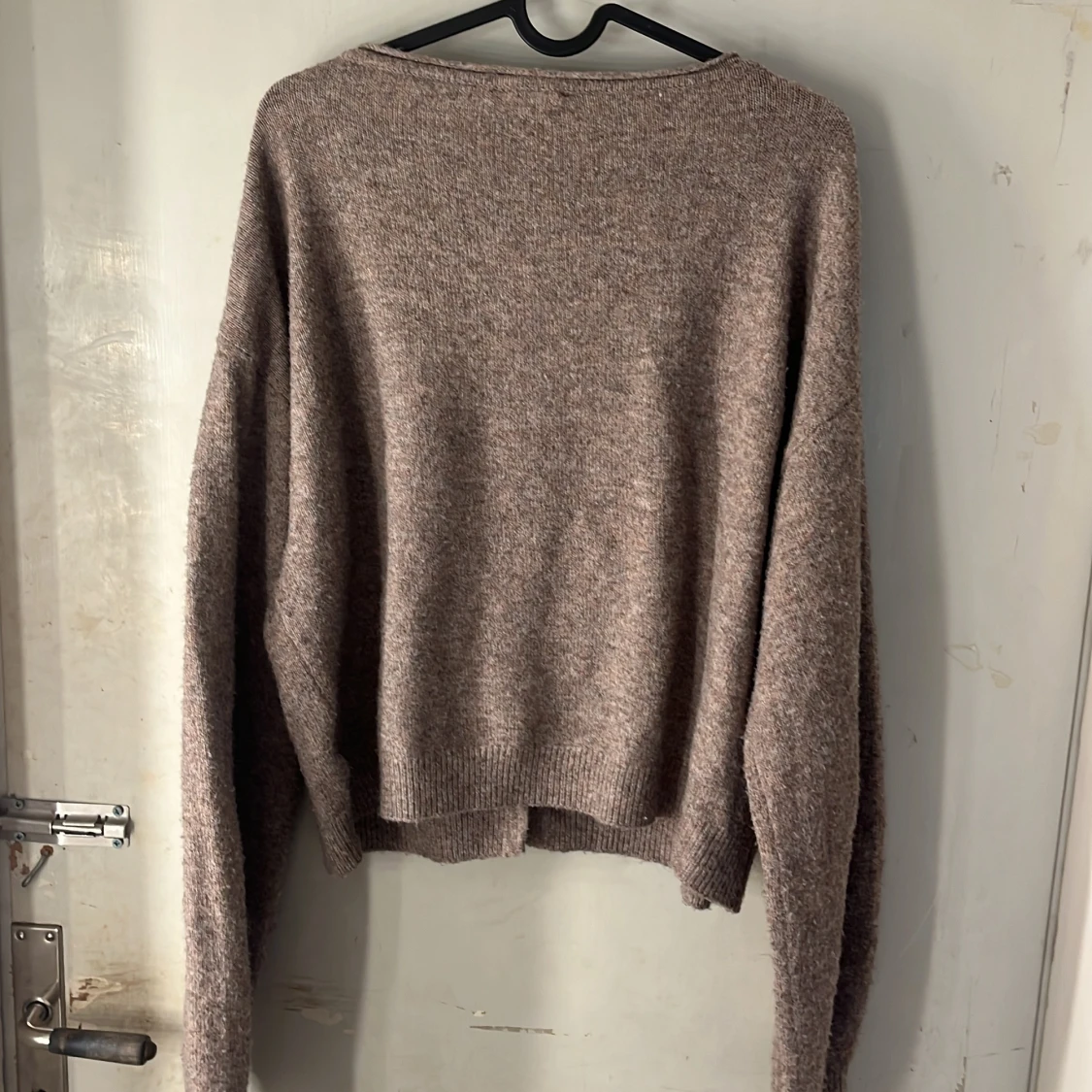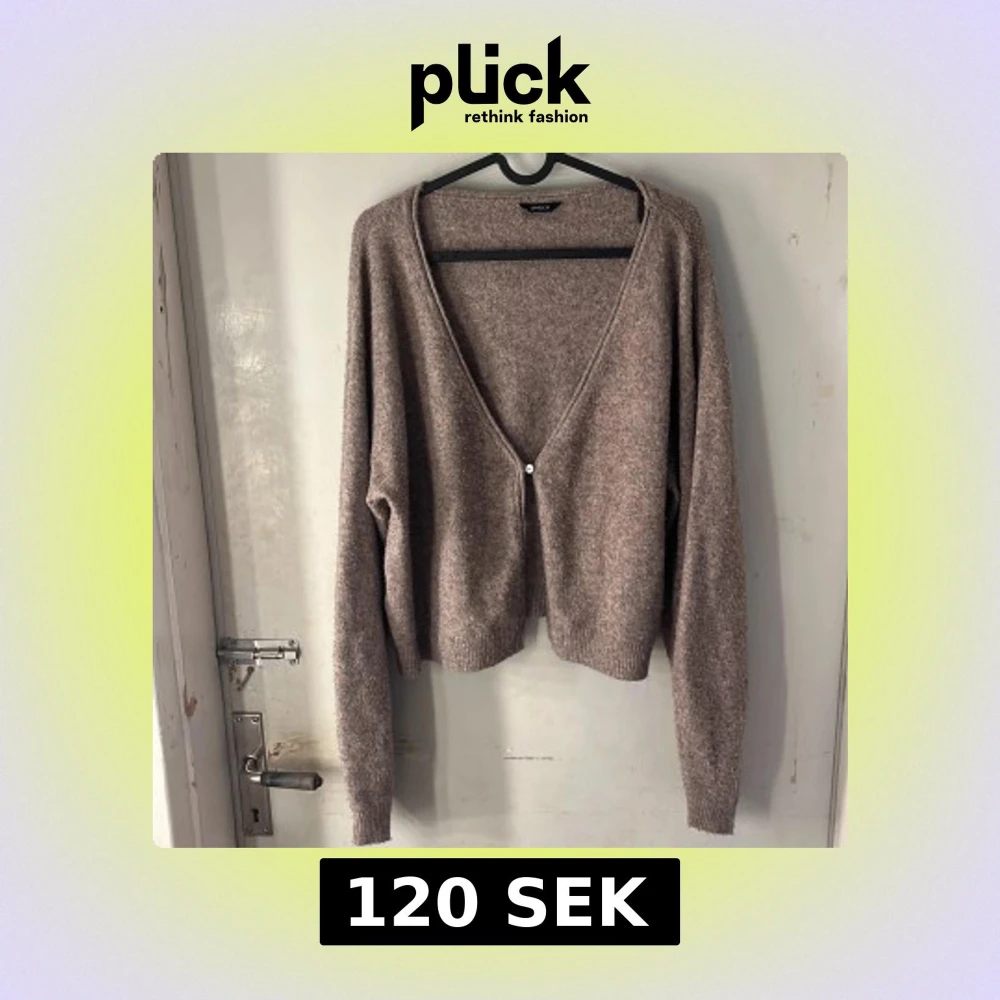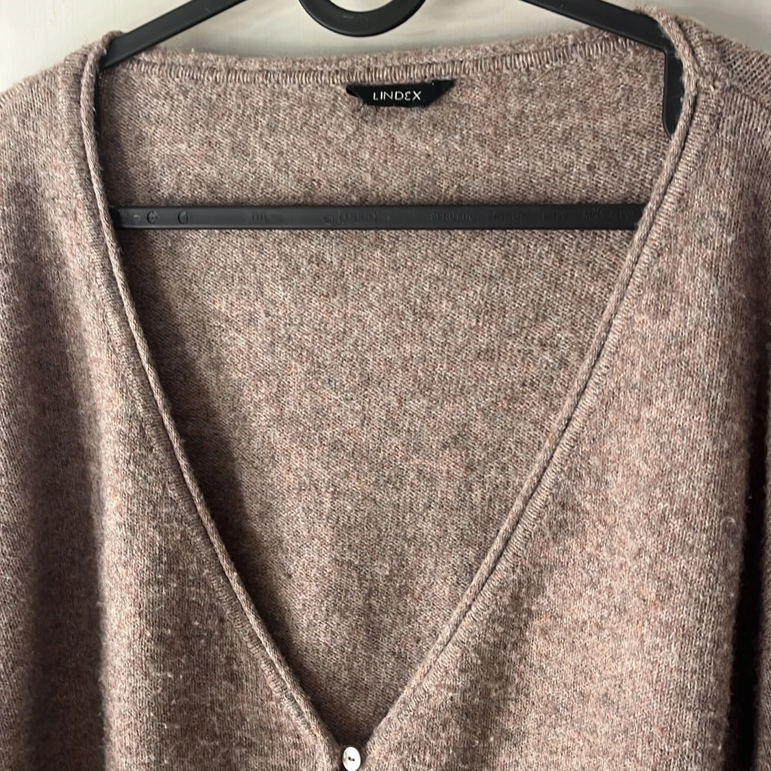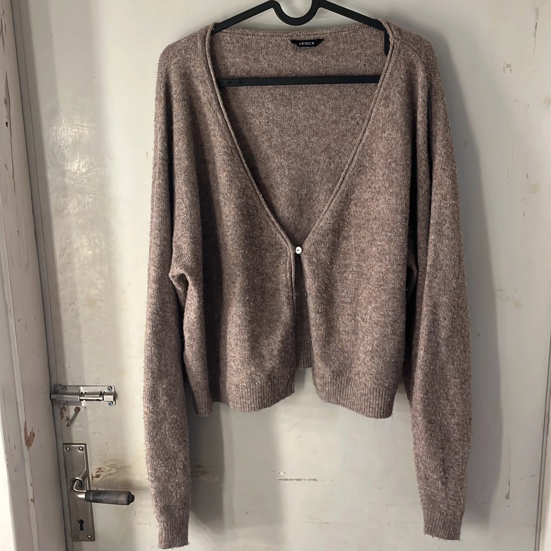 Mysig beige kofta från Lindex med djup v-ringning och en knapp framtill. Tröjan är croppad med ribbade muddar och har lång ärm. Perfekt för lager-på-lager och chill stil. Materialet är stickat och känns mjukt mot huden.