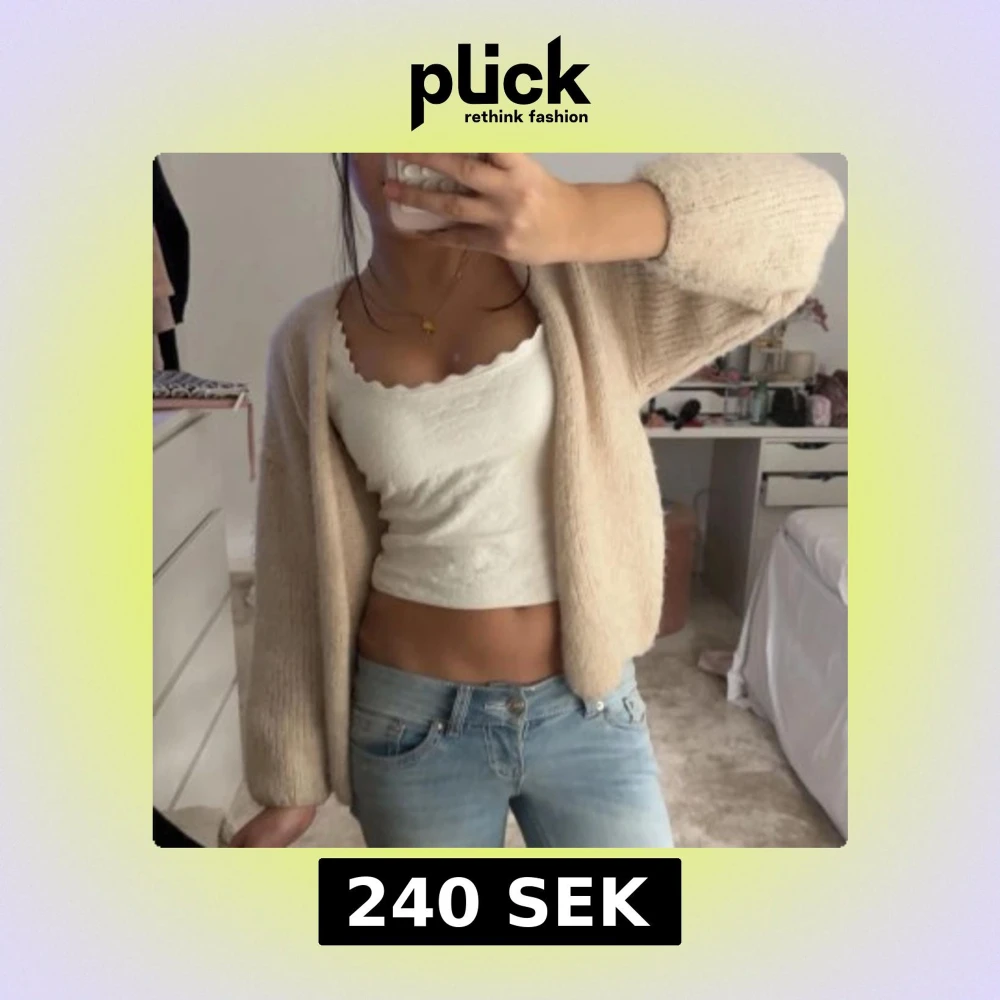 Mysig beige stickad cardigan jacka med lång ärm och öppen front. Jackan har en avslappnad passform och är perfekt att slänga på sig över en topp. Lite nopprig