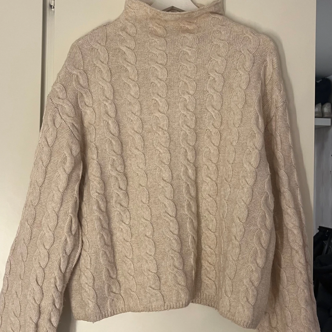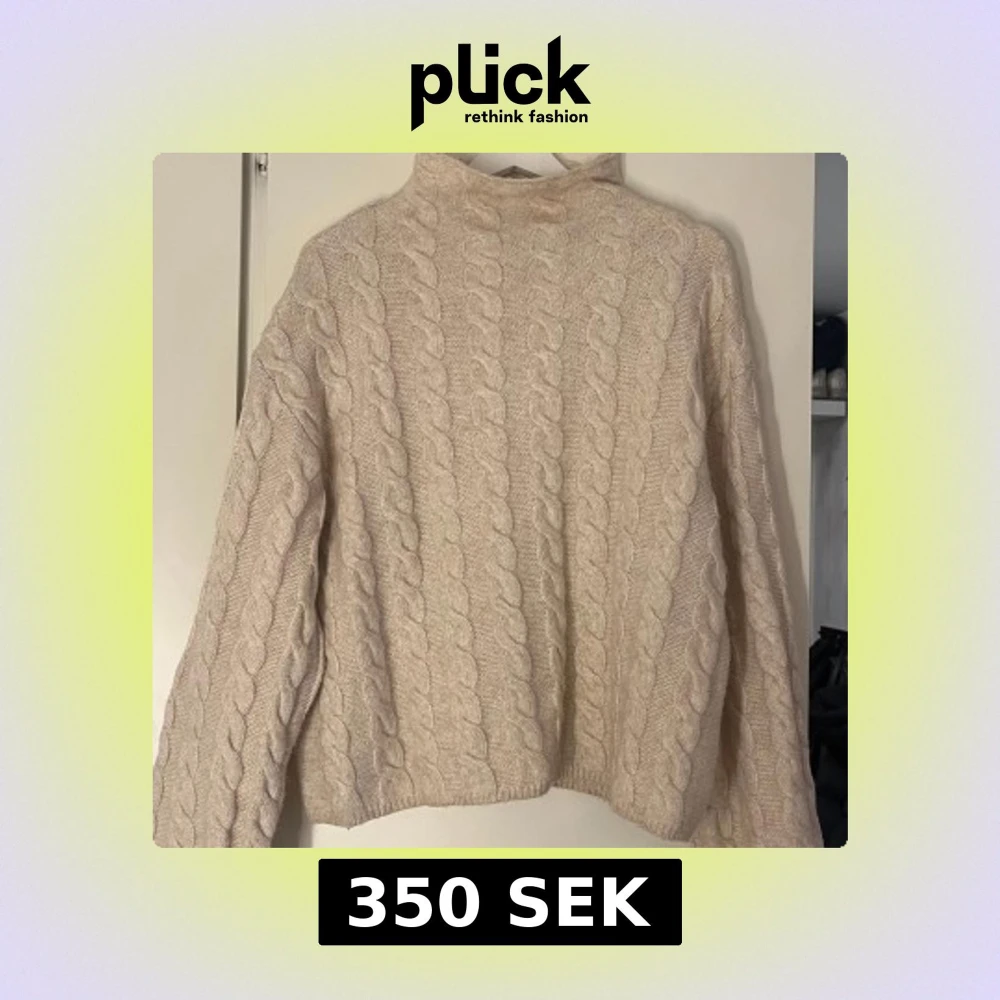 Mysig beige stickad tröja från Lindex med kabelstickat mönster. Perfekt för kyliga dagar med sin höga krage och långa ärmar🥰 använd en gång