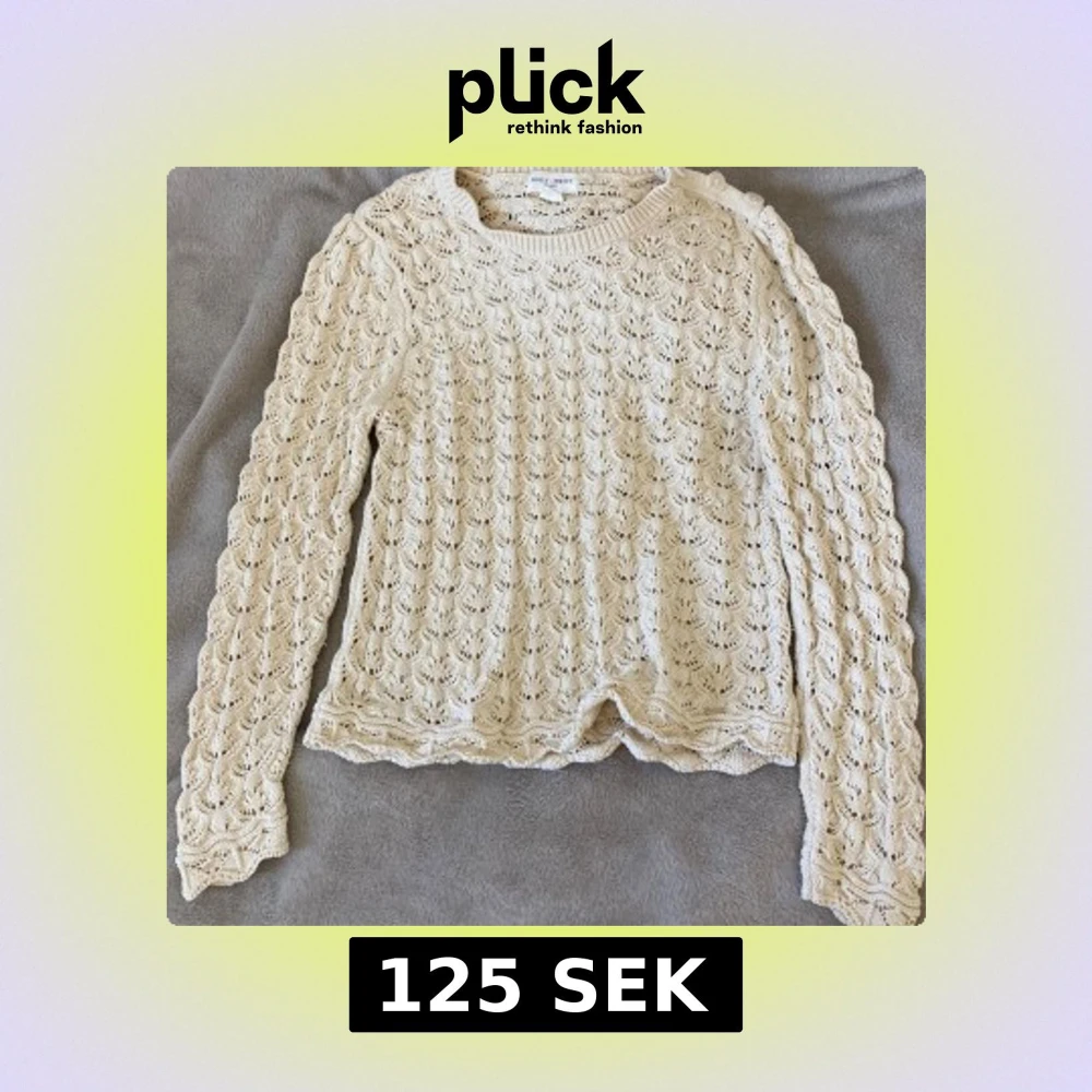 Superfin beige stickad tröja från Lindex med snyggt hålmönster och dekorativa knappar på ena axeln. Tröjan har långärmad passform och rund halsringning, perfekt för lager-på-lager under höst och vår.