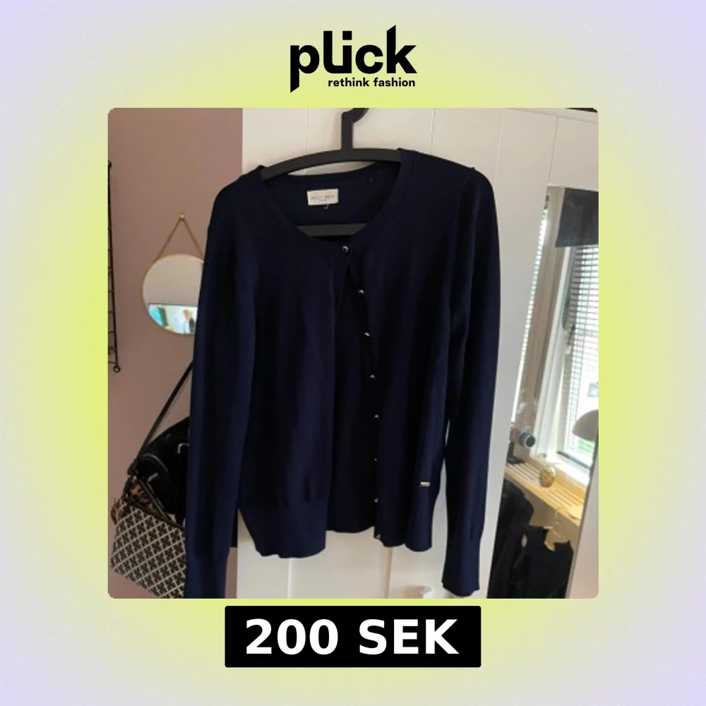 Säljer en stilren mörkblå kofta från Holly & Whyte. Koftan har guldiga knappar framtill och en klassisk rund halsringning. Är inte helt säker på storleken då den lappen inte längre sitter på tröjan men jag tor att det är storlek L men passar M också.
