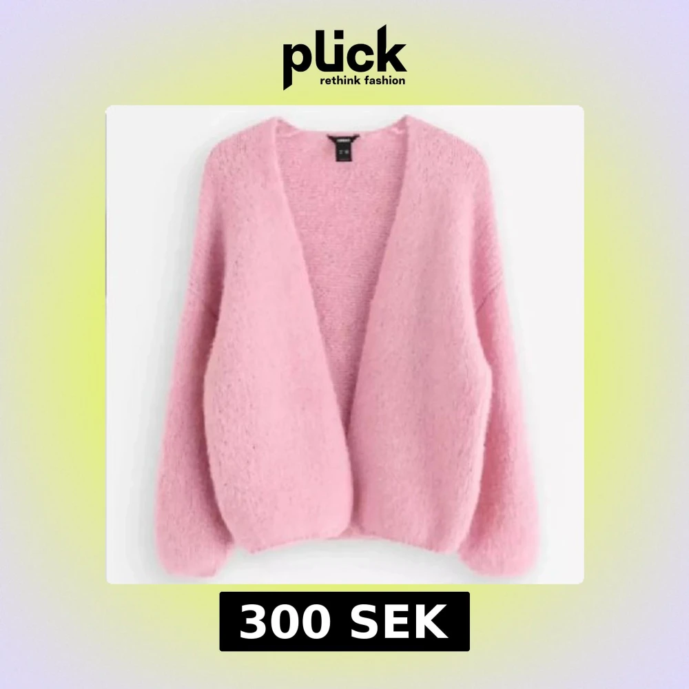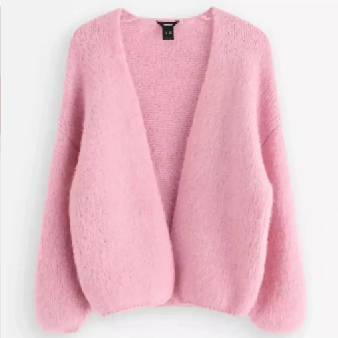 Supermysig ljusrosa kofta från Gina Tricot med oversized passform och långärmade, puffiga ärmar. Koftan är stickad och har en öppen front utan knappar eller dragkedja, vilket gör den enkel att slänga på över en topp. Perfekt för att ge din outfit en soft vibe.