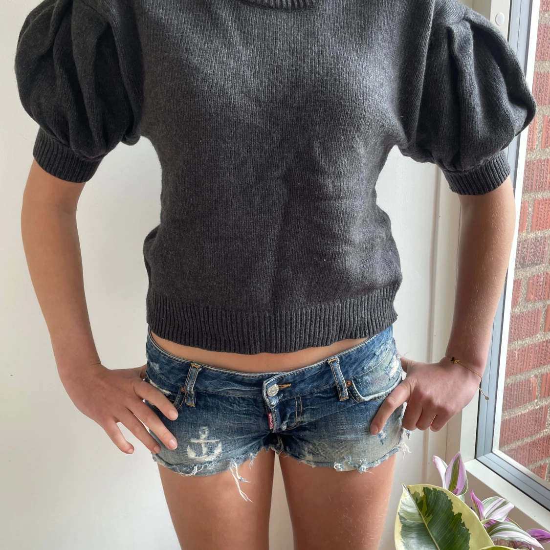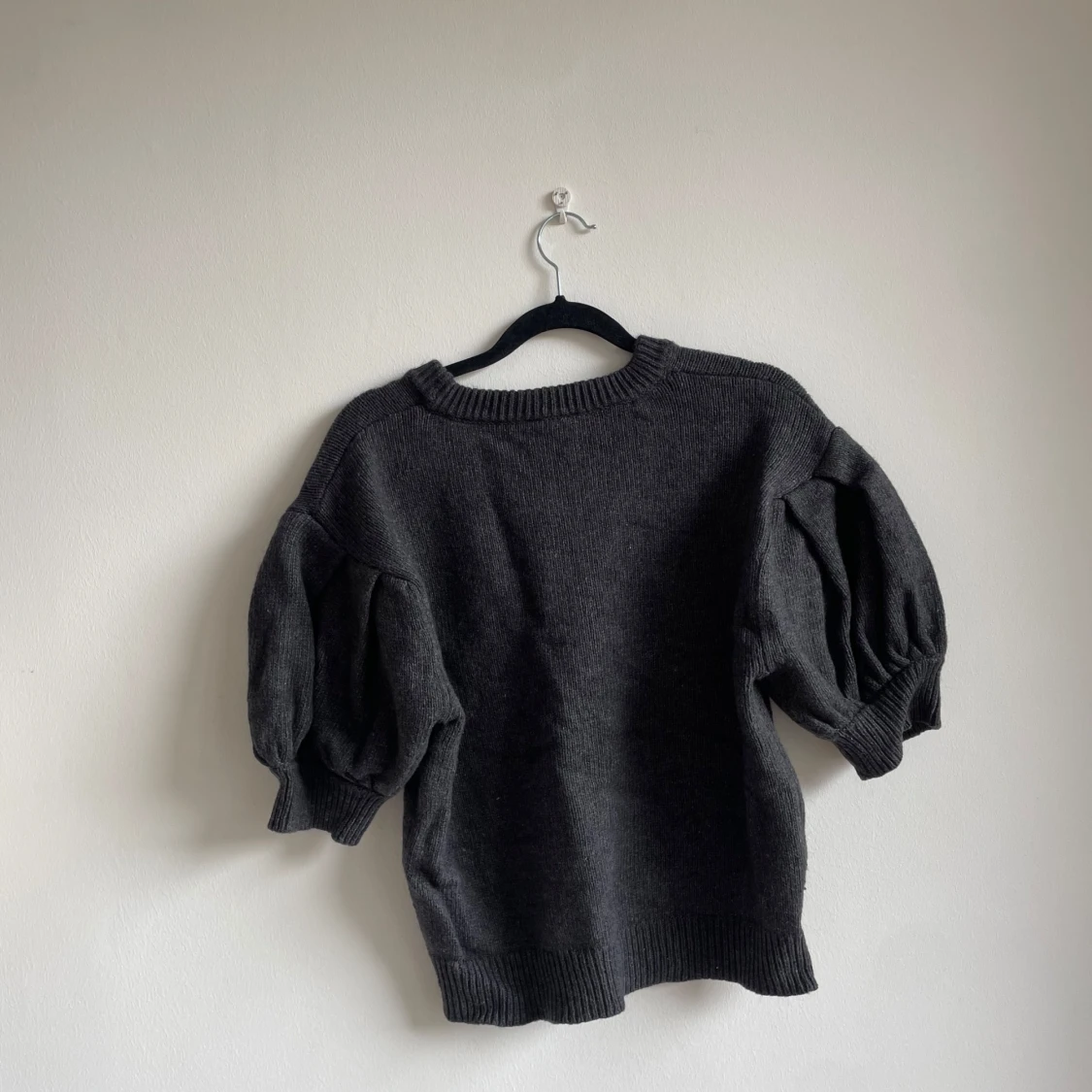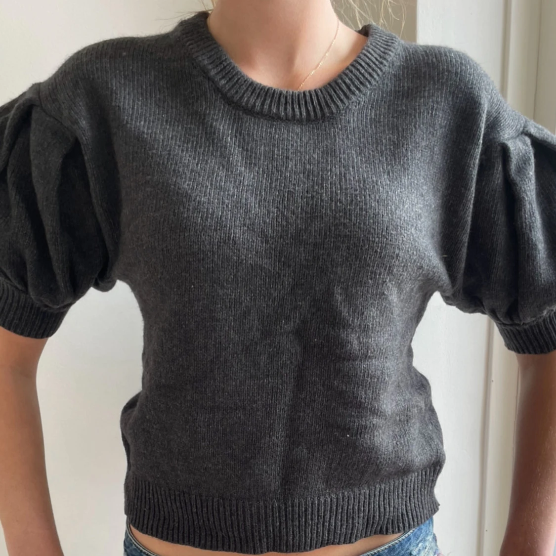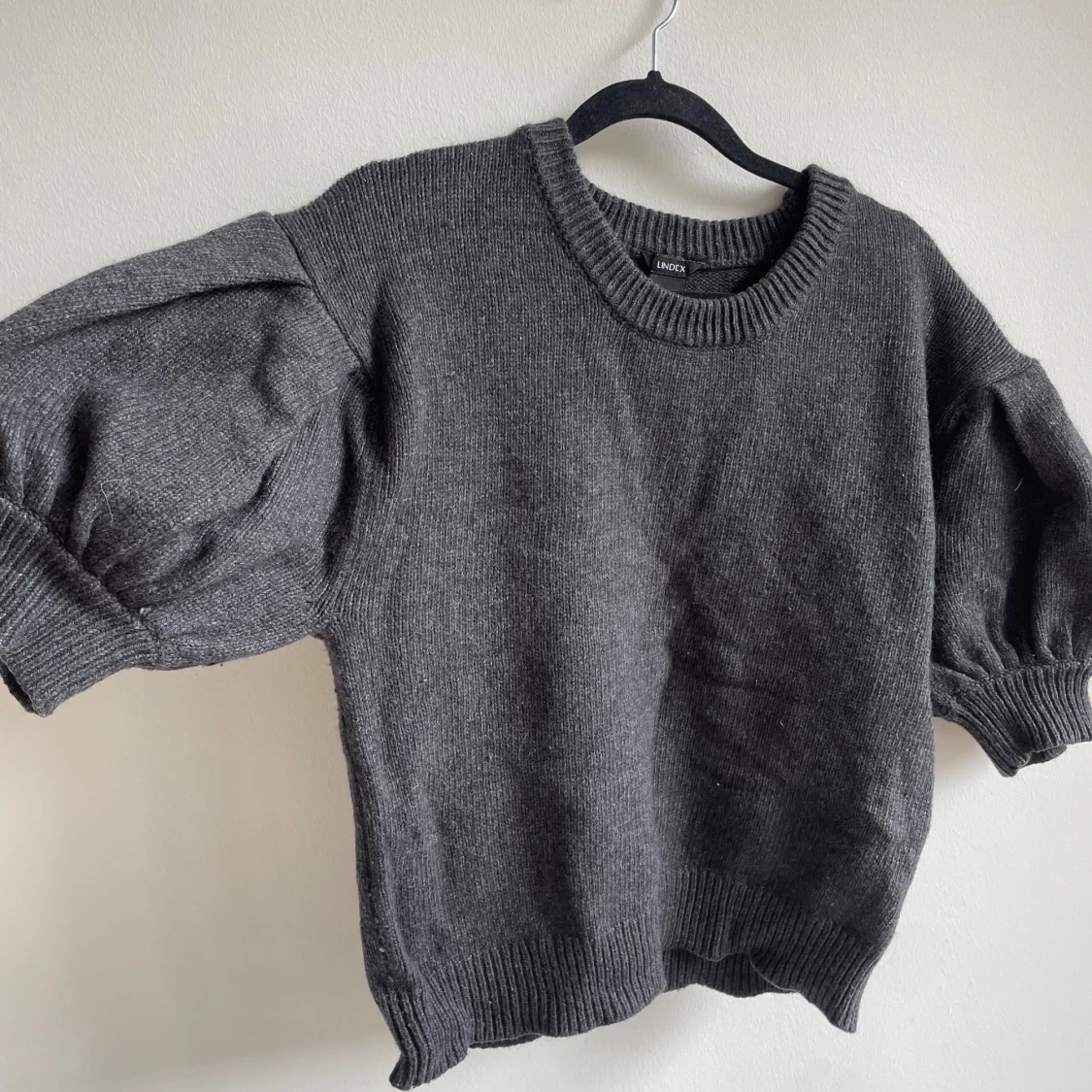 Mörkgrå stickad tröja från Lindex med korta puffärmar och bred ribbad kant vid ärmslut och nederkant. Tröjan har rund halsringning och en loose fit som ger en chill vibe. Perfekt att styla med jeans eller kjol för en trendig look.