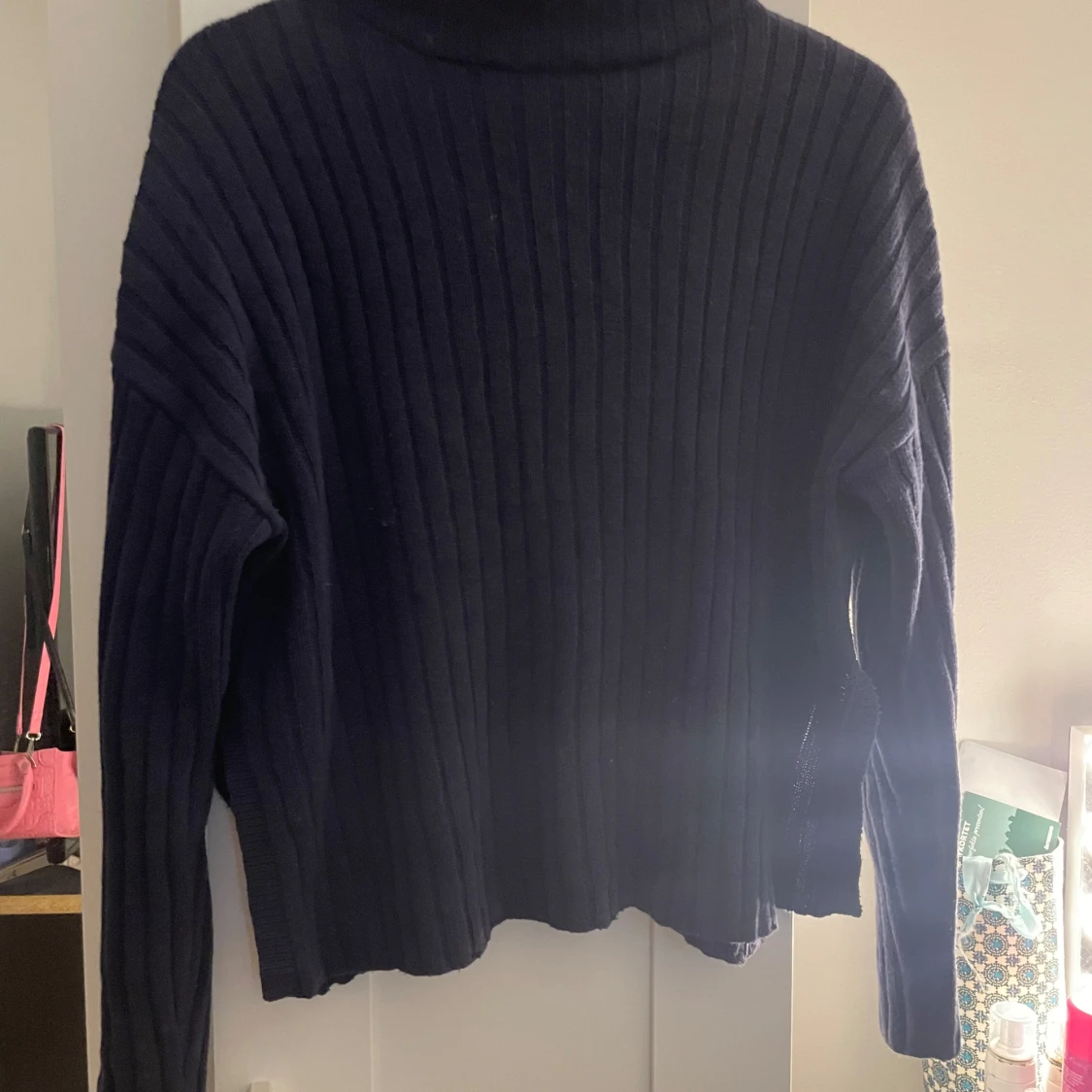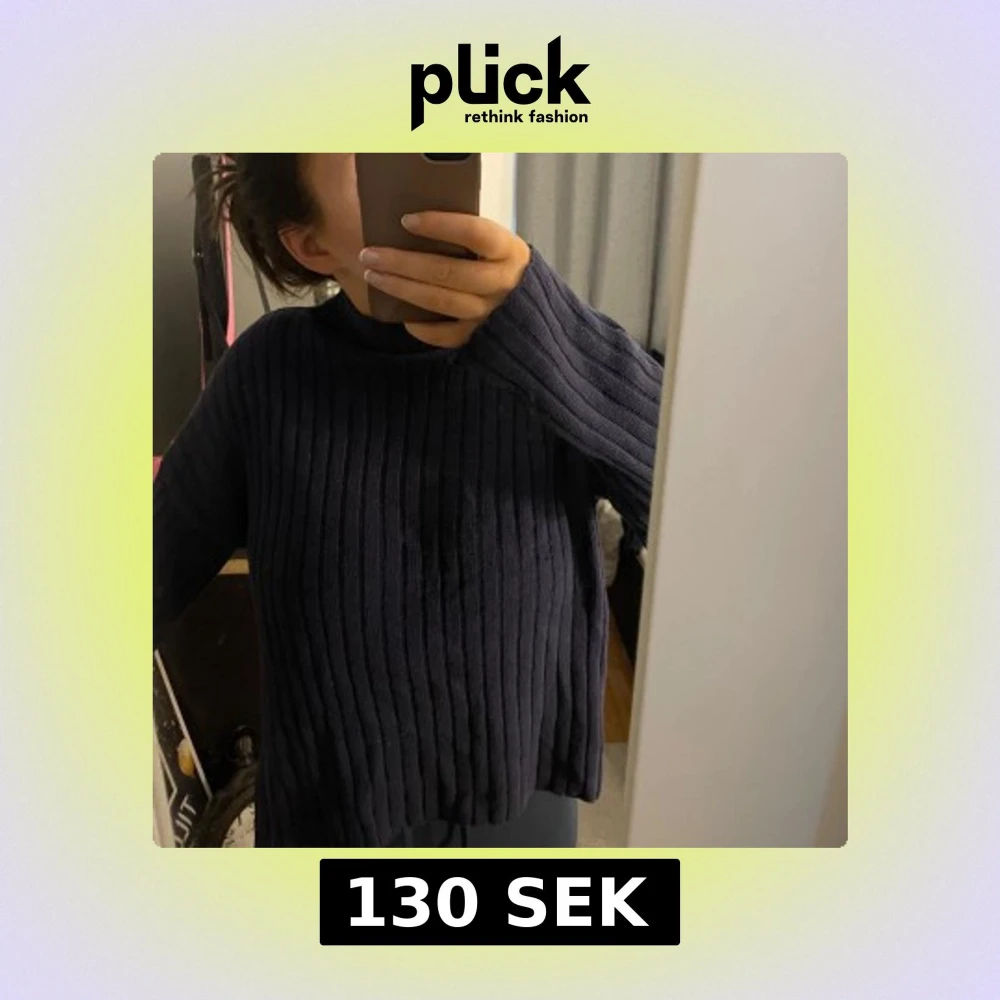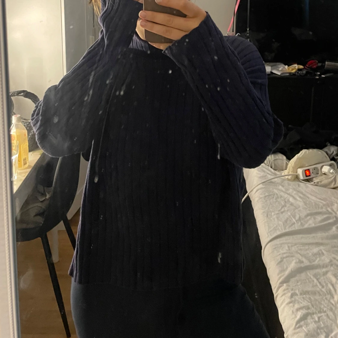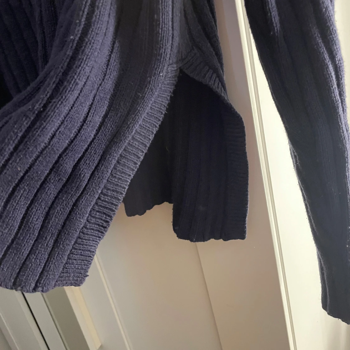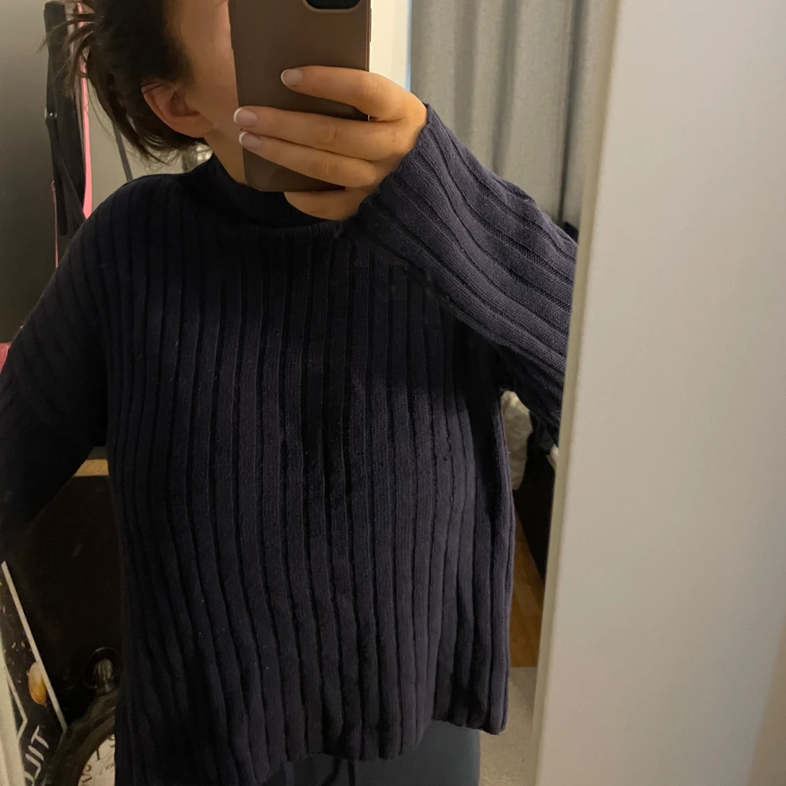Säljer en snygg mörkblå ribbad tröja med långa ärmar och halvpolokrage. Tröjan har en bekväm passform och slits längst ner på sidorna