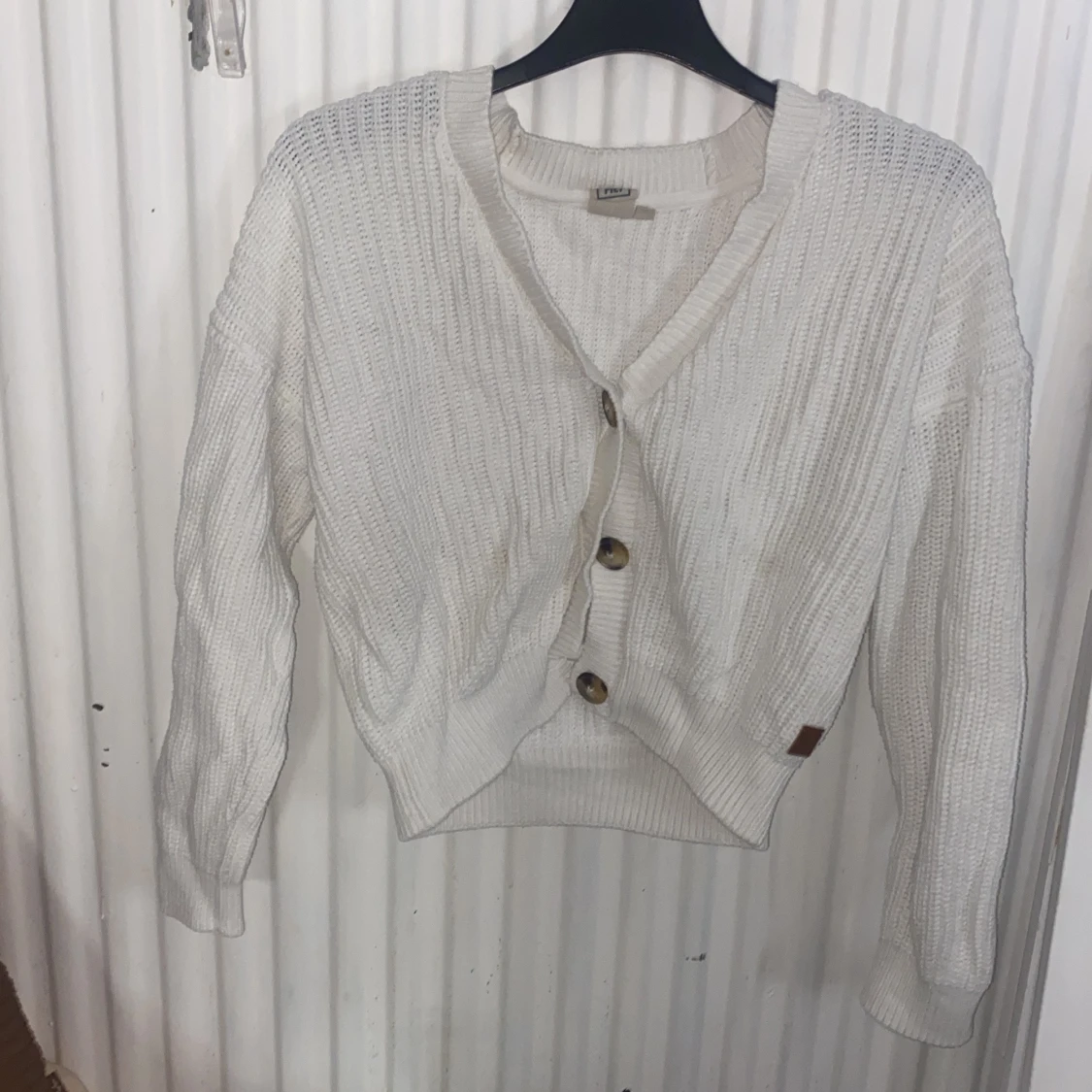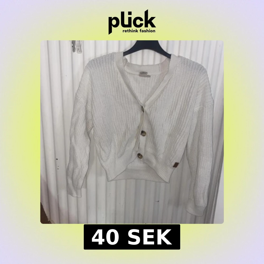 Mysig vit stickad kofta från Lindex med stora bruna knappar framtill. Koftan har en avslappnad passform, ribbade muddar och lång ärm. Perfekt att slänga på sig över en t-shirt eller linne för en chill look.