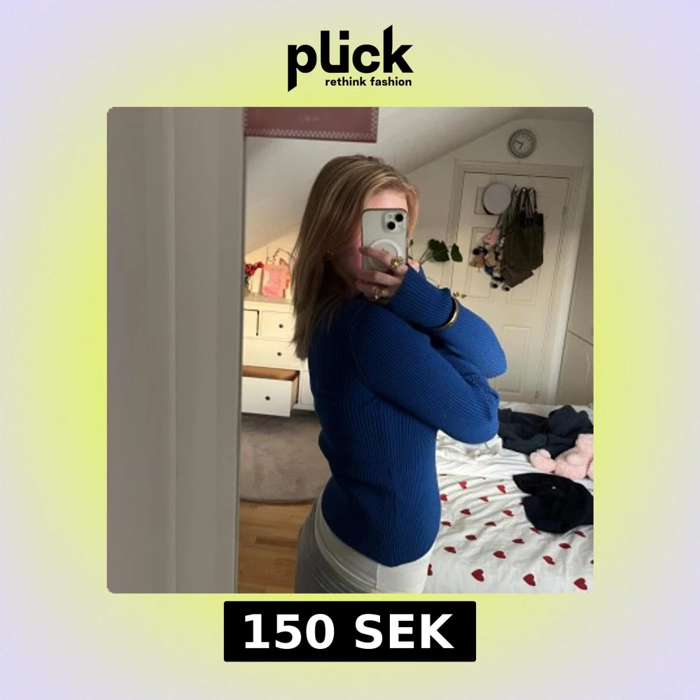 Säljer en snygg blå ribbad tröja med lång ärm. Perfekt för en stilren look och passar bra till både jeans och kjol. Tröjan har en figurnära passform som framhäver silhuetten.