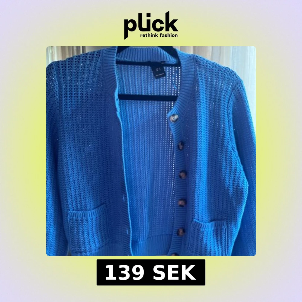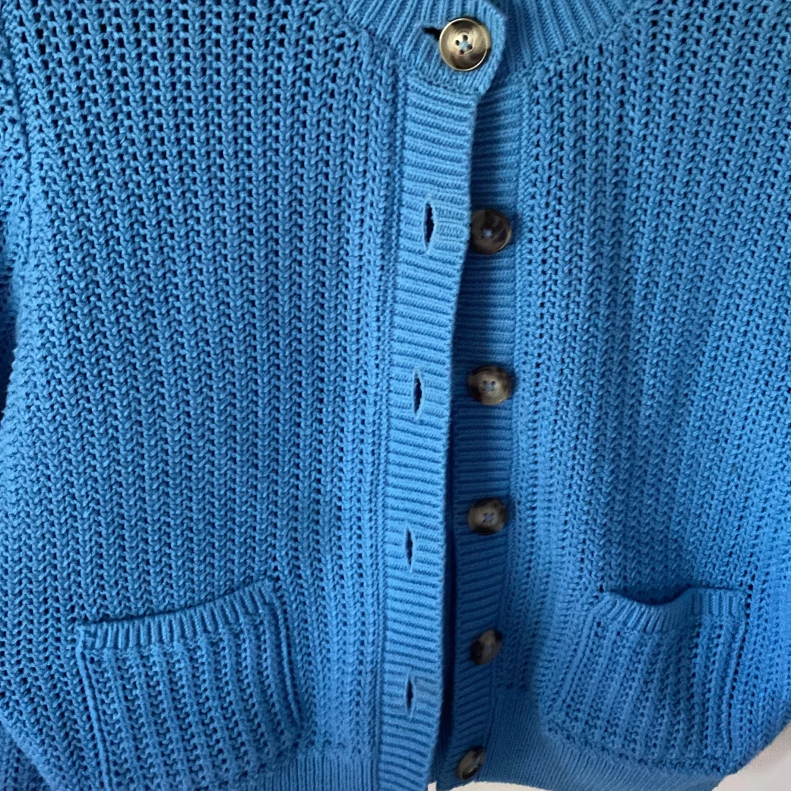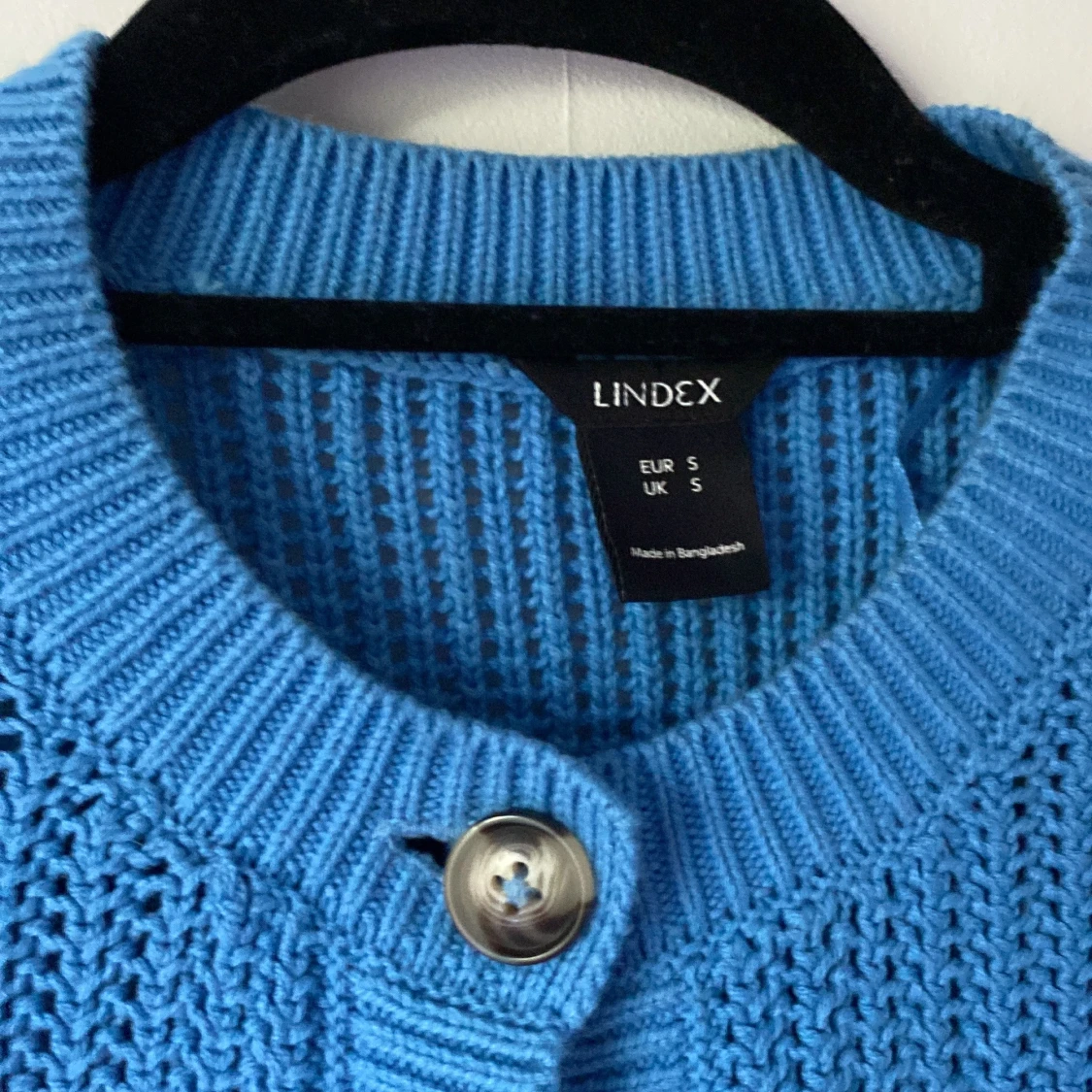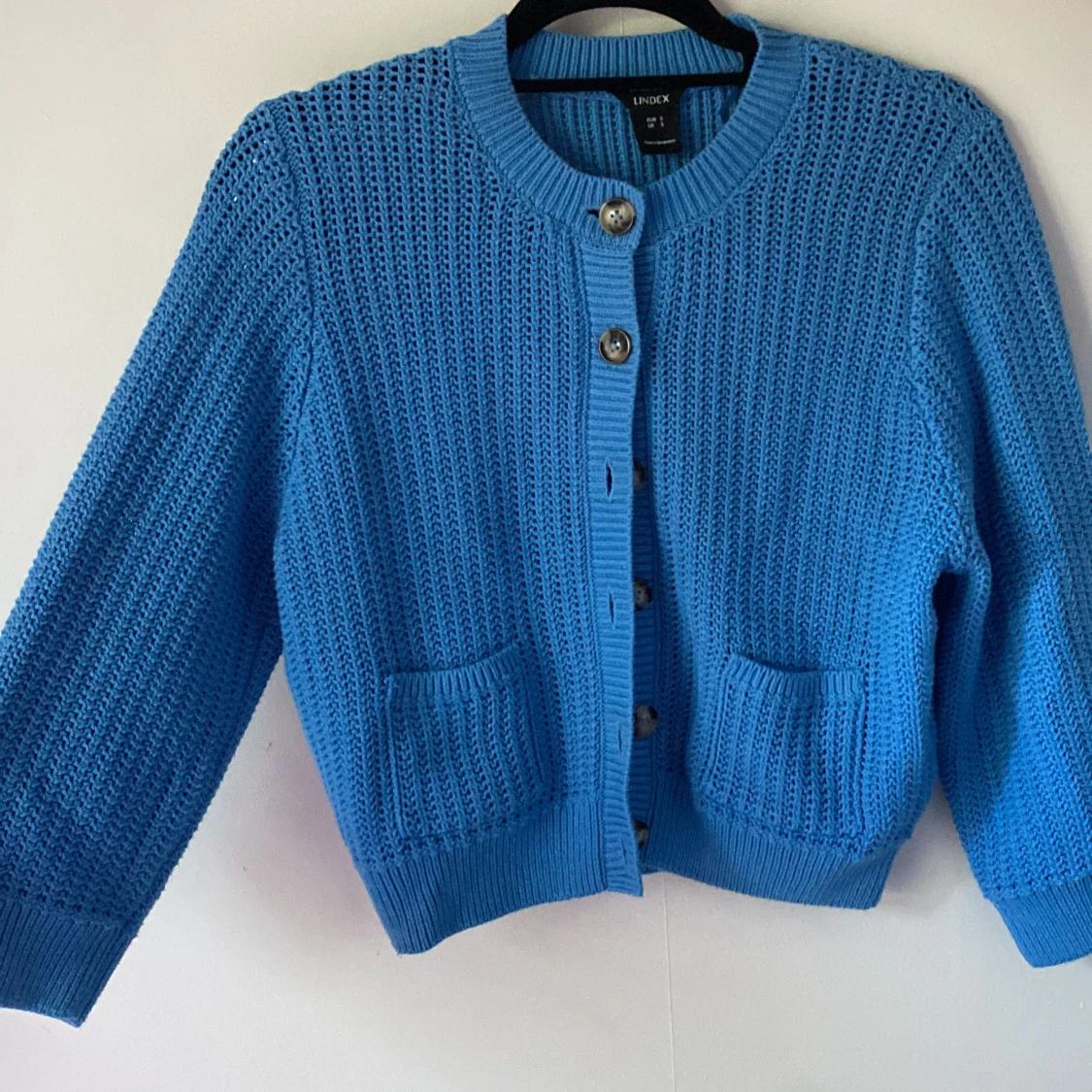 Snygg blå stickad kofta från Lindex i storlek S. Koftan har grovstickat mönster, ribbade muddar, två fickor framtill och knäpps med stora knappar. Perfekt att slänga över en t-shirt för en chill look.