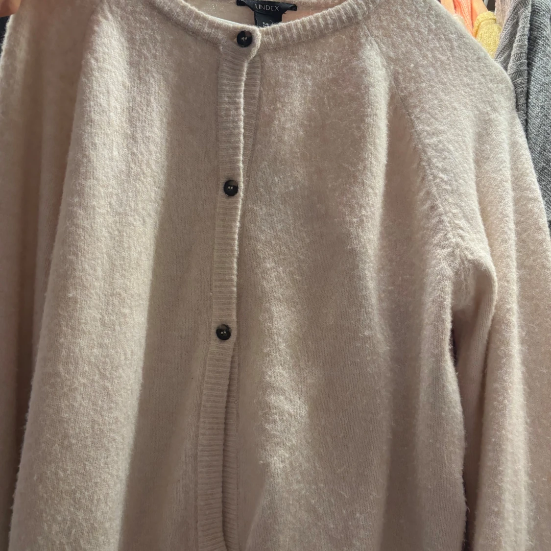 Mysig beige kofta från Lindex med rund hals och svarta knappar framtill. Tröjan har långärmad design och är tillverkad i ett fluffigt stickat material som känns skönt mot huden. Perfekt till hösten! 🍁 hör av er om frågor!