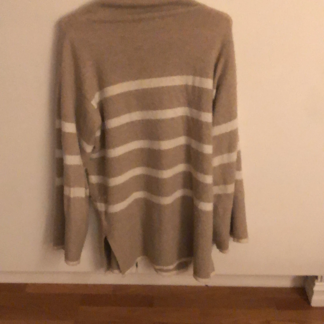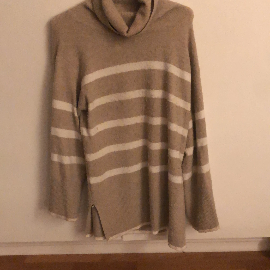 Mysig beige polotröja från Lindex med vita ränder. Tröjan har långa ärmar och en bekväm passform, perfekt för kyligare dagar. Den är tillverkad i ett mjukt material som känns skönt mot huden. Denna tröja är inte så flitigt använt men det är den absolut skönaste och gosigaste tröjan jag haft på mig!!❤️ passar en xs-M