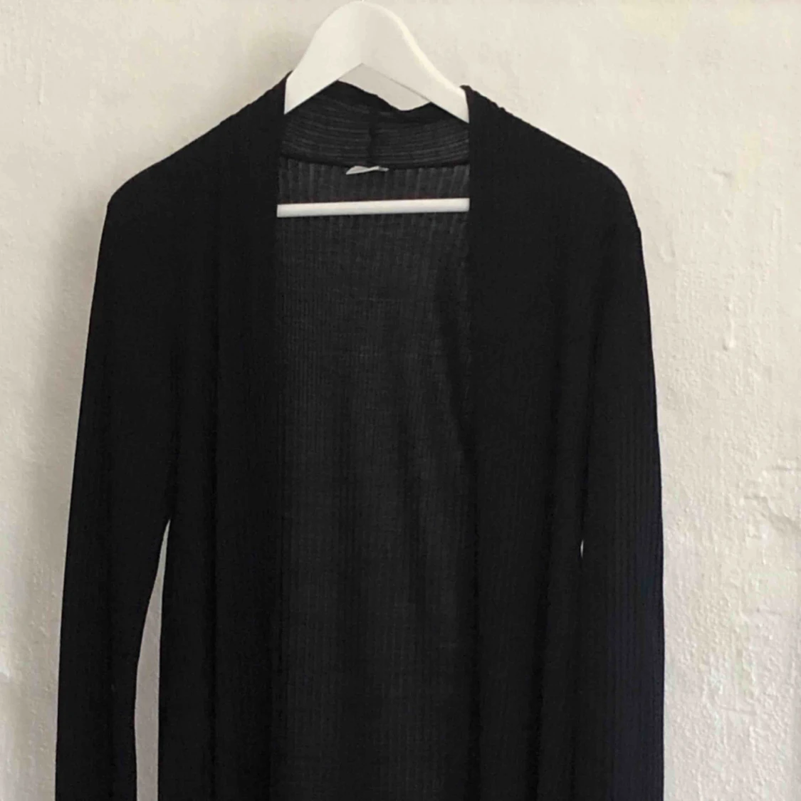 Svart lång kofta. Randig i tyget.