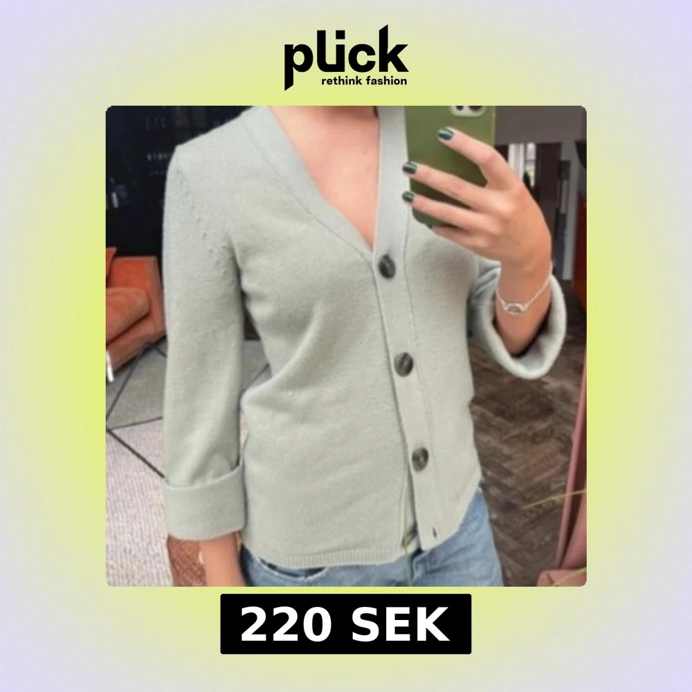 Säljer en ljusgrön kofta med stora knappar framtill. Koftan har trekvartsärmar och en v-ringad.💞