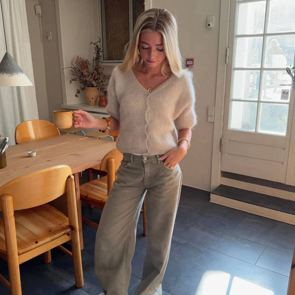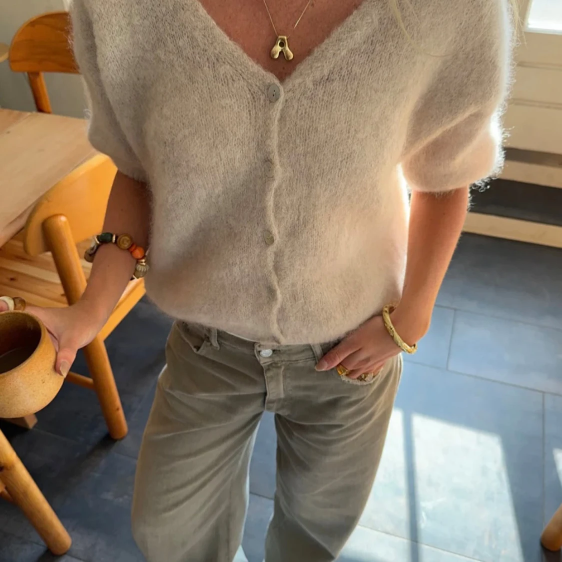 Ljusbeige fluffig kofta med kort ärm