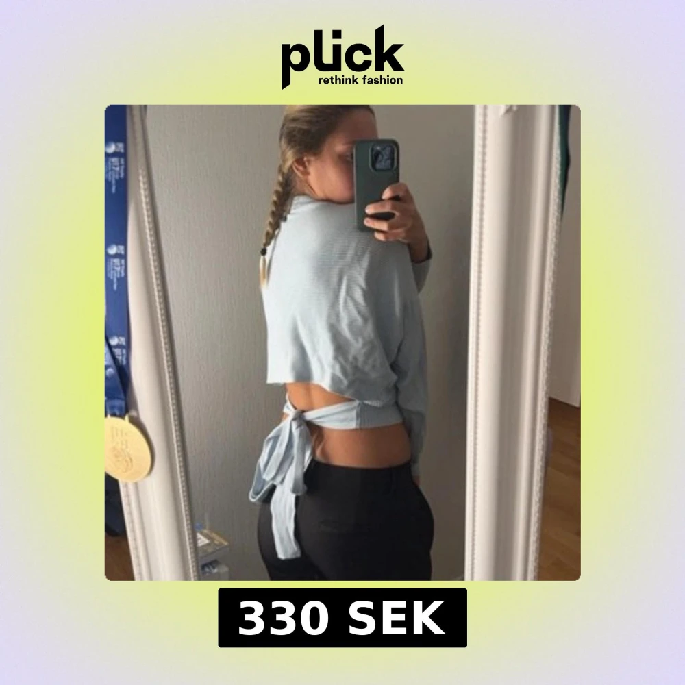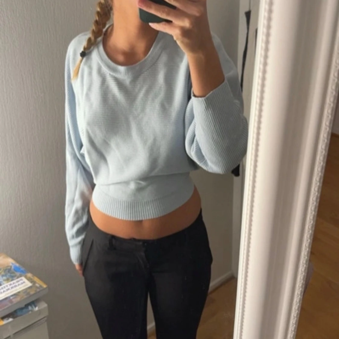 Säljer en ljusblå croppad tröja med långa ärmar och snygg knytning i ryggen. Tröjan har en rund halsringning och är i ett ribbat material som ger en skön passform. Perfekt för dig som vill ha en trendig och bekväm look. Har aldrig använd eftersom den är stor för mig