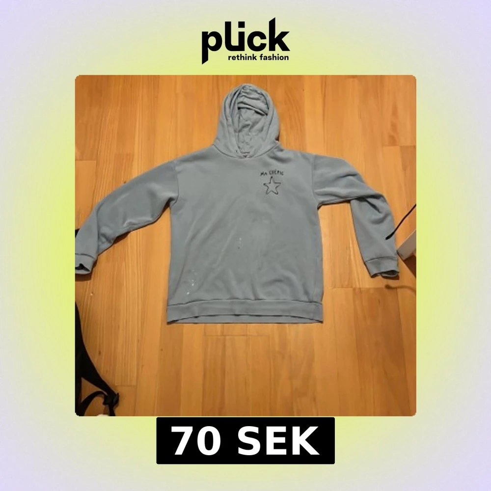 Säljer en ljusblå hoodie med texten 'MA CHÉRIE' och en stjärna tryckt på både fram- och baksidan. Säljer då den inte kommer till användning.