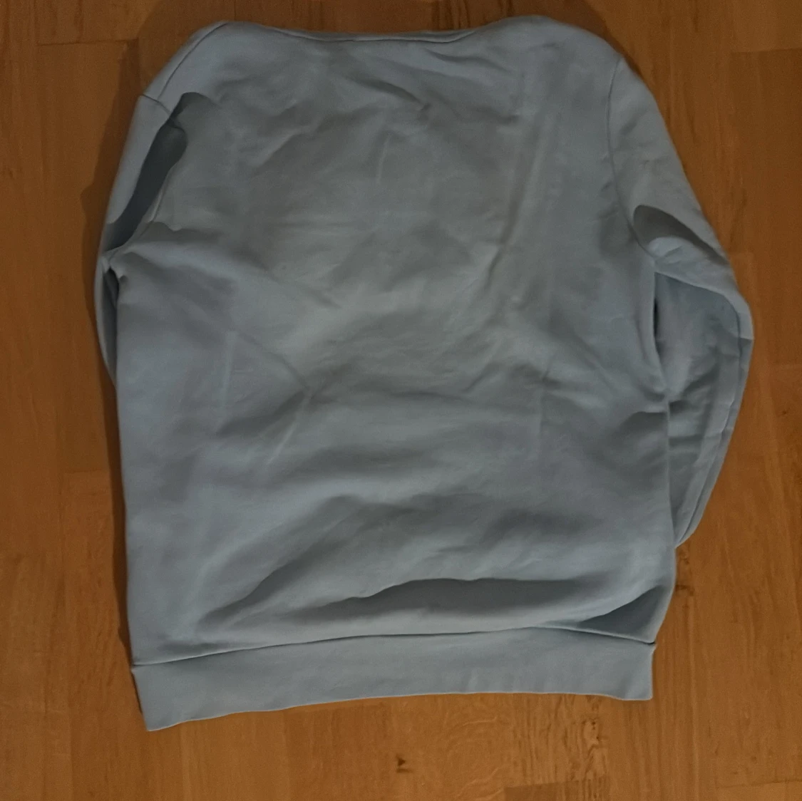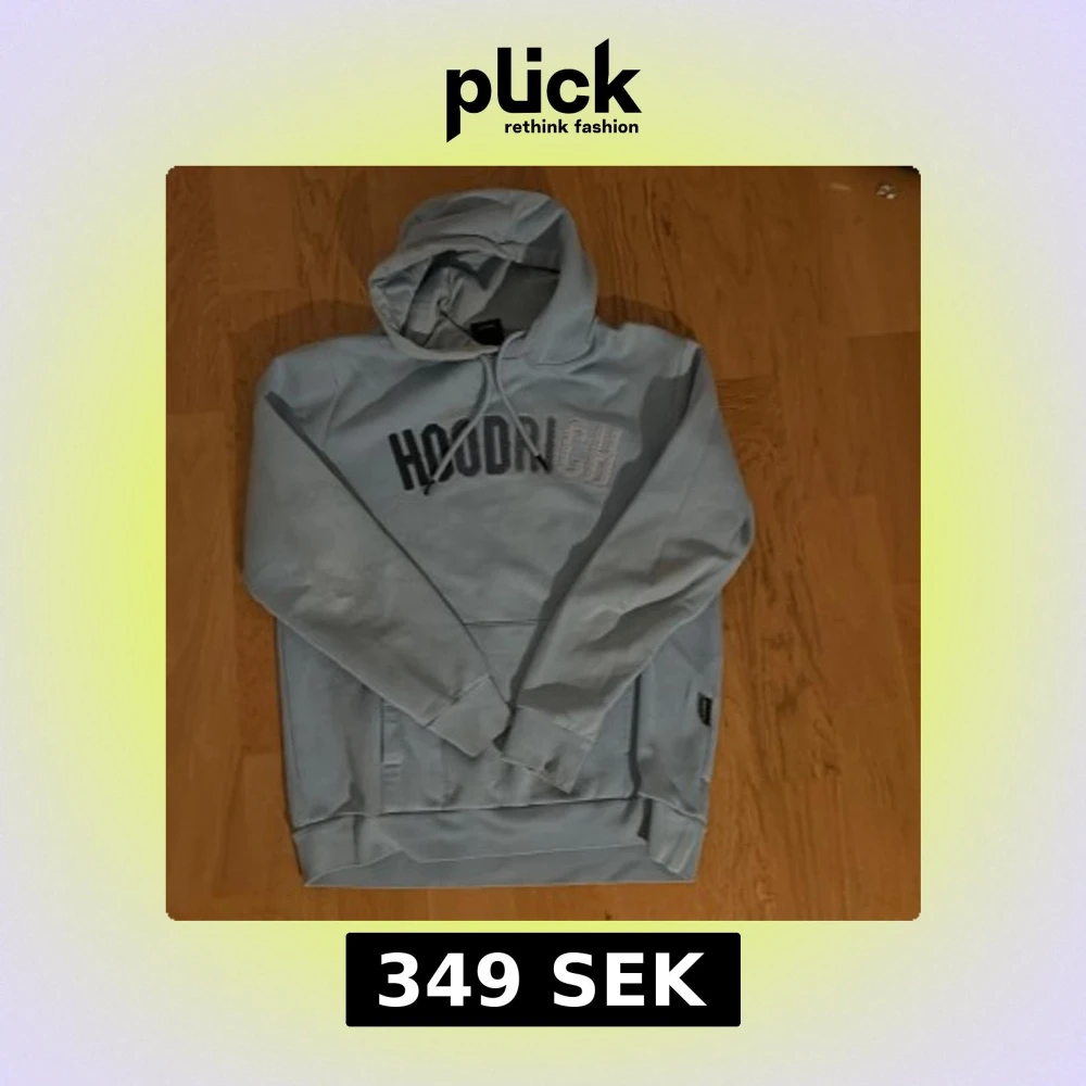 Säljer en ljusblå hoodie från Hoodrich med stor broderad logga på bröstet. Tröjan har huva med snörning och en stor magficka framtill. Perfekt för dig som gillar streetwear och vill ha en chill look.