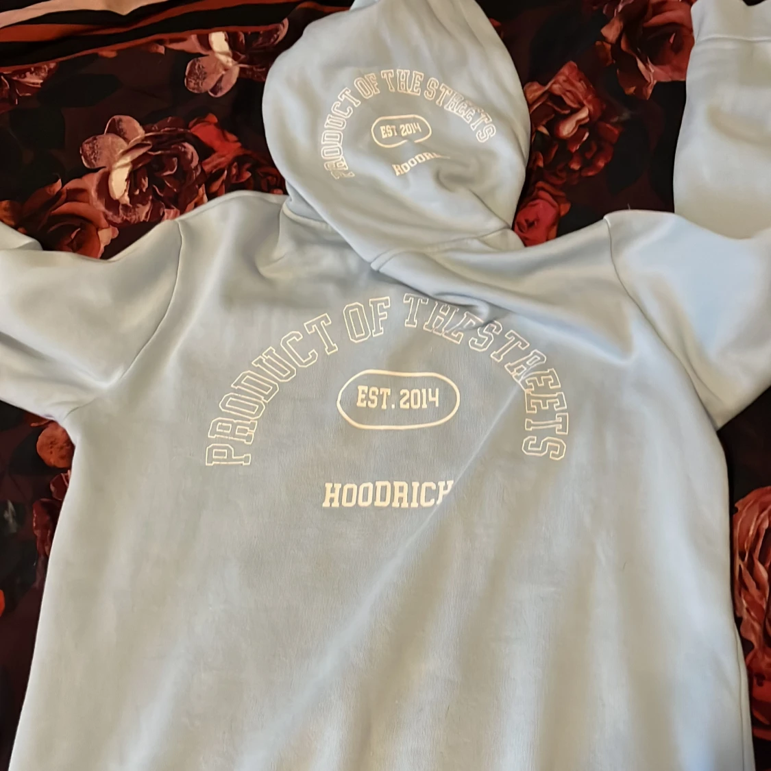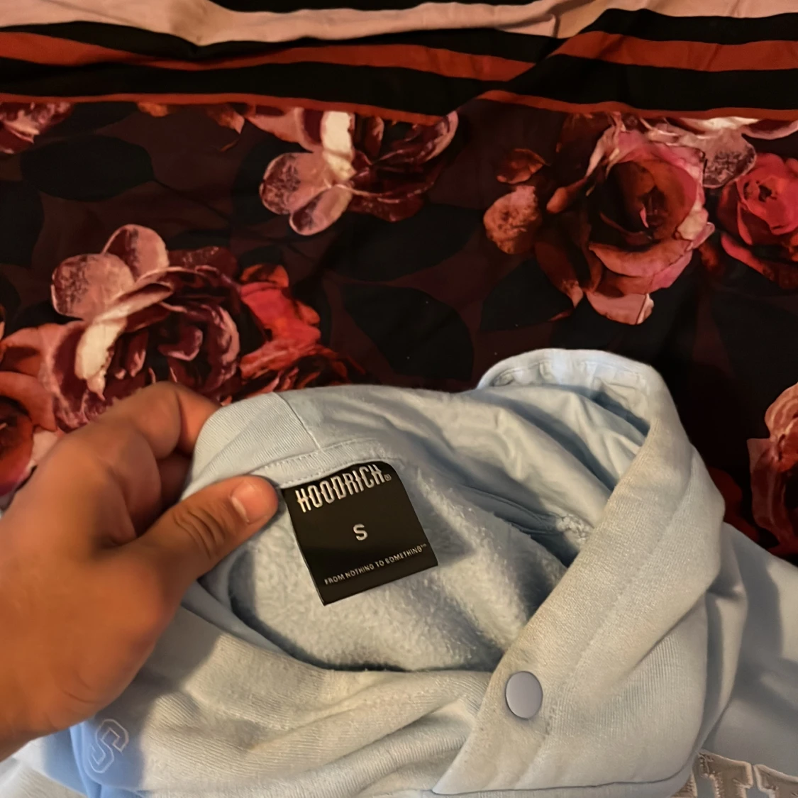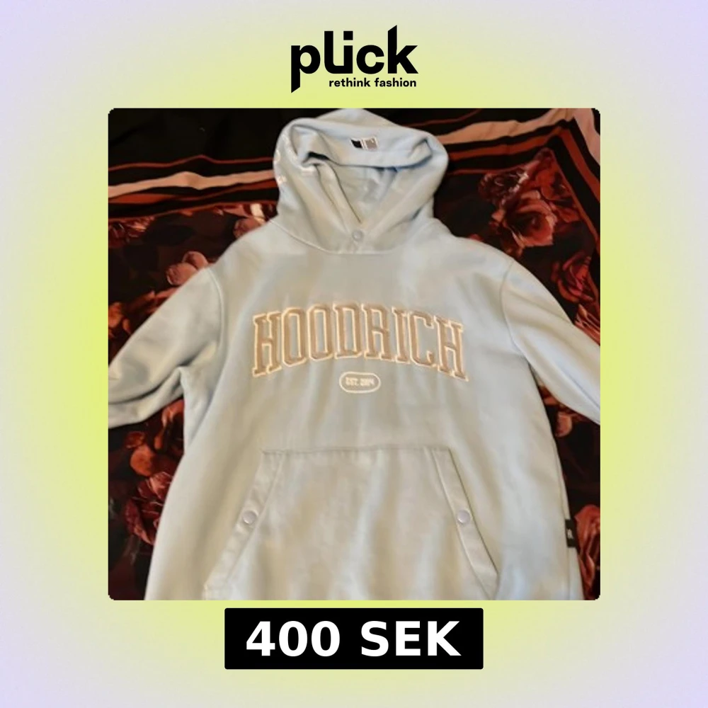 Säljer en ljusblå hoodie från Hoodrich i storlek S. Tröjan har stor broderad logga framtill, tryck på ryggen och huva. Praktisk magficka med knappar och mjukt material som känns skönt mot huden. Perfekt för chill eller streetwear.