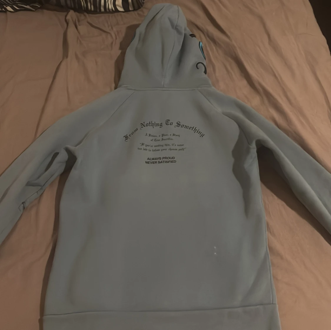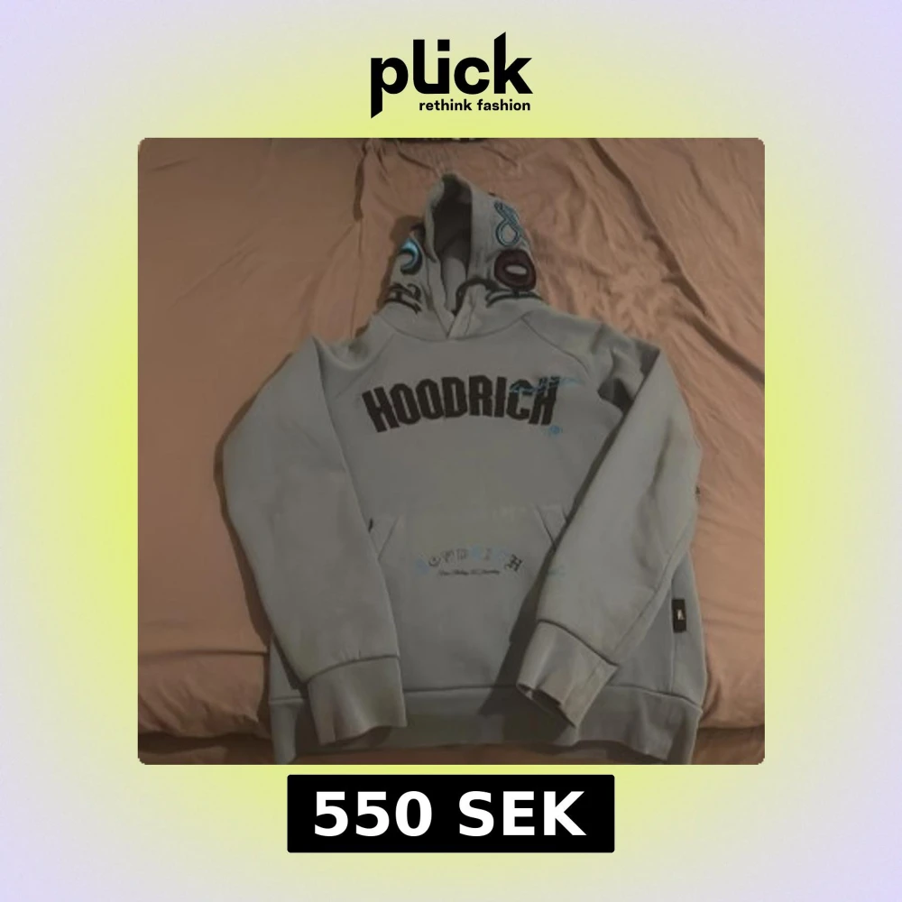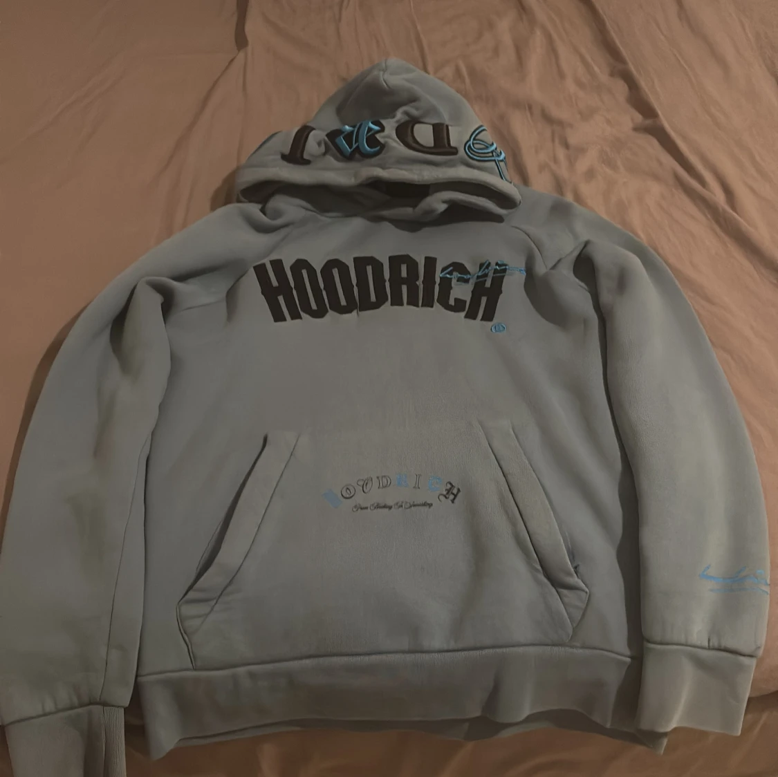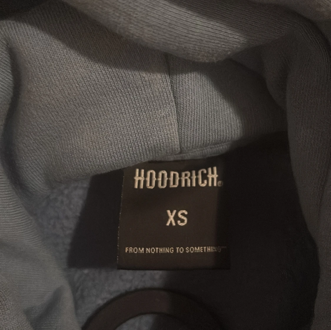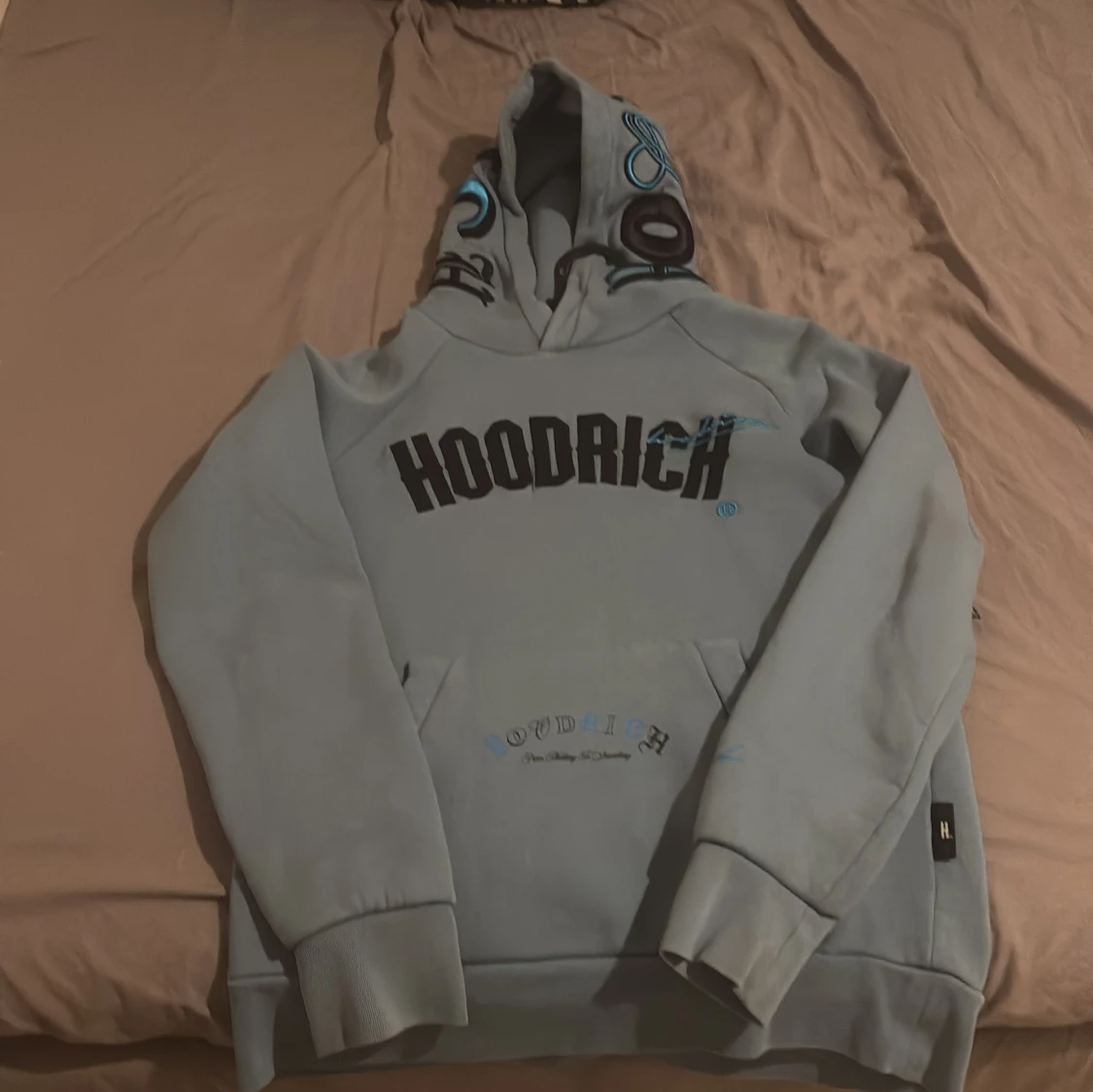Säljer en ljusblå hoodie från Hoodrich i storlek XS. Tröjan har stor svart logga framtill, tryck på fickan och text på ryggen. Huva med tryck och klassisk känguruficka. Perfekt för dig som gillar streetwear och vill sticka ut.