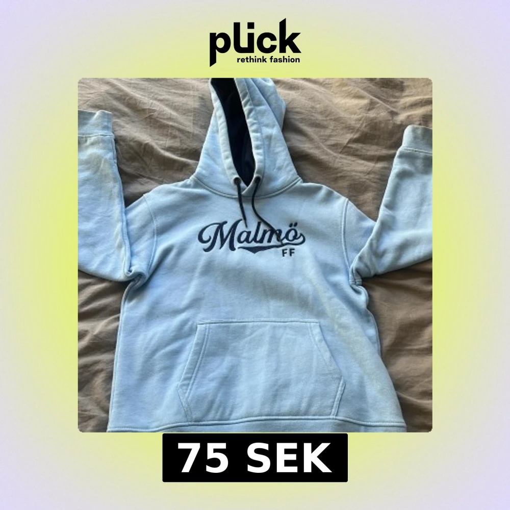 Säljer en ljusblå hoodie från Malmö FF med mörkblå text på framsidan. Tröjan har en stor ficka framtill och en justerbar huva med mörkblåa snören. Perfekt för alla Malmö FF-fans!🩵Lite stänk fläckar