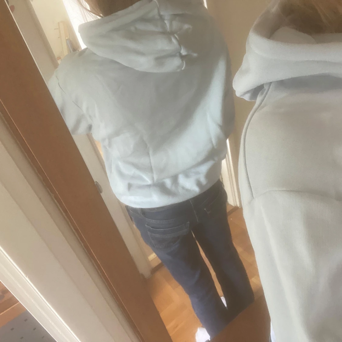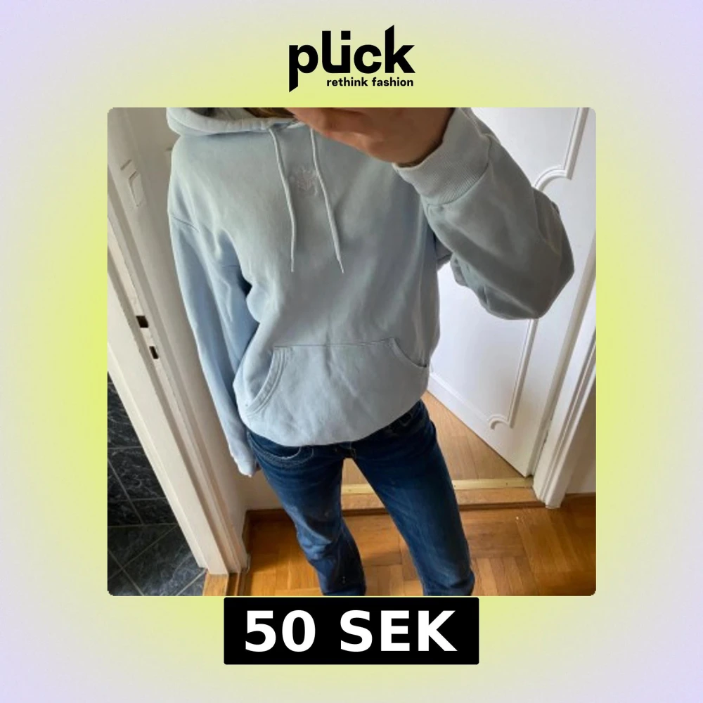 Säljer en ljusblå hoodie från monki med klassisk huva och magficka. Tröjan har långa ärmar och en avslappnad passform, perfekt för en chill vardagslook. Med ett gulligt litet tryck på framsidan 😊
