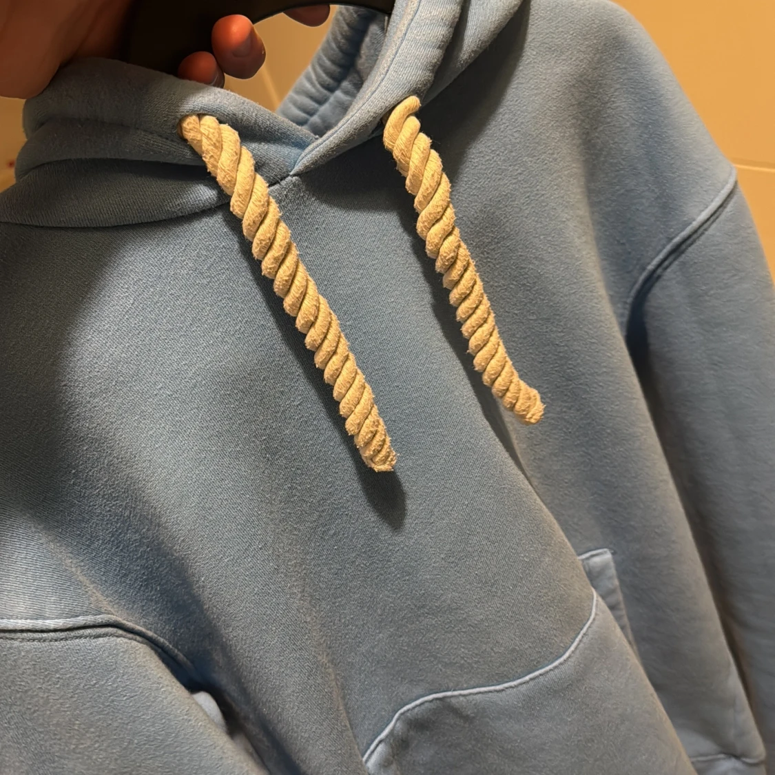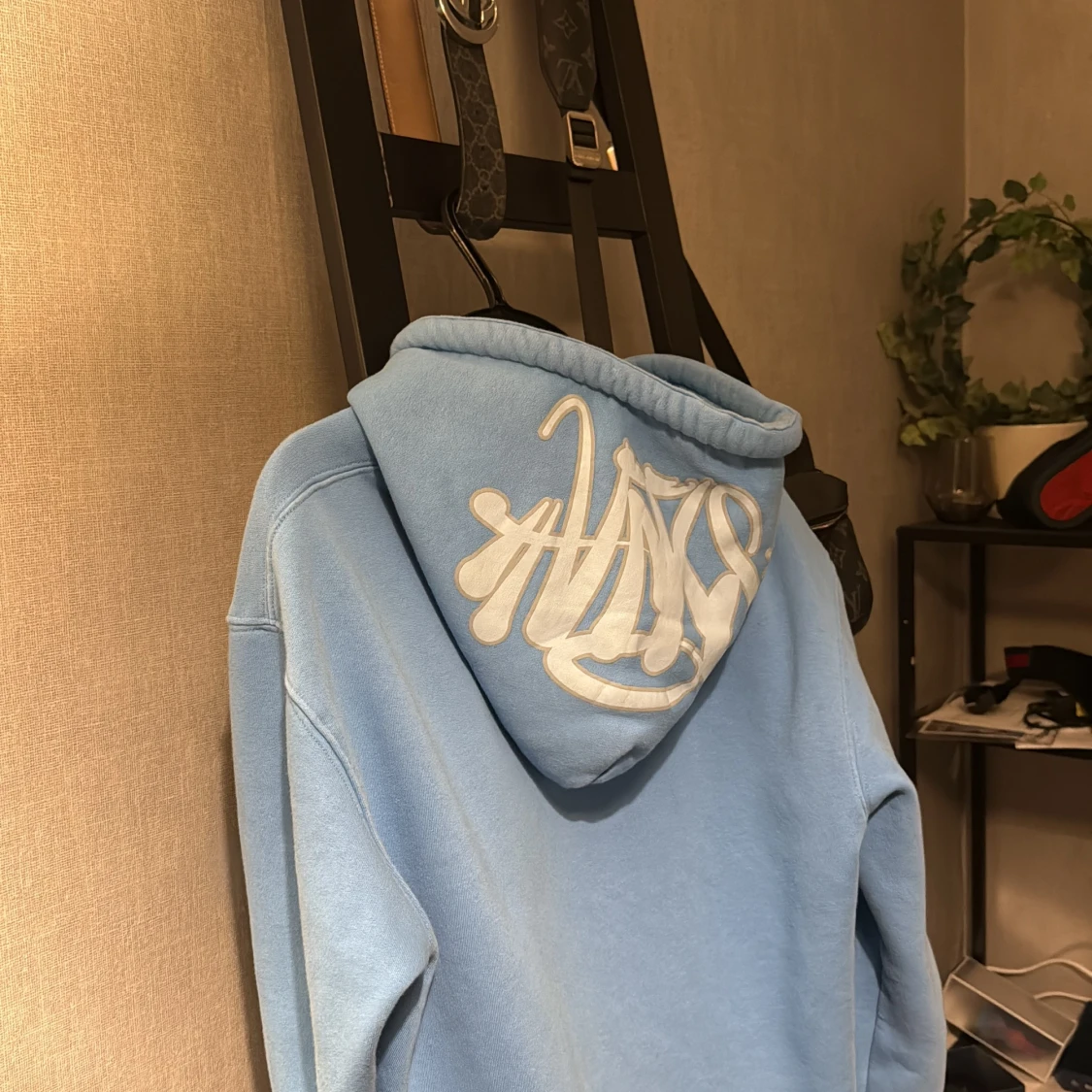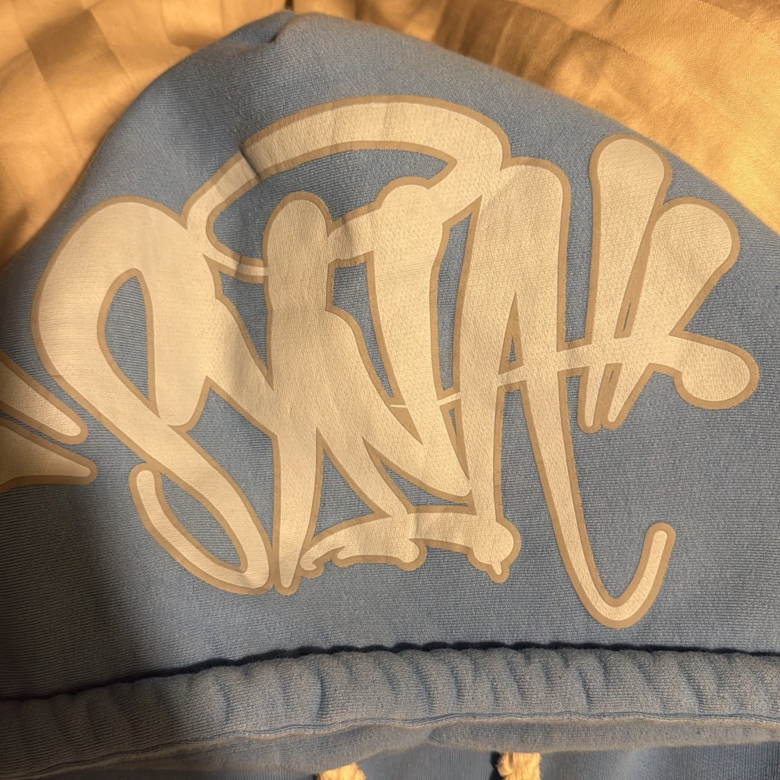 Ljusblå hoodie från syna world med vit graffiti-logga på huvan och grova, tvinnade snören. Klassisk känguruficka framtill och mjukt material som känns riktigt skönt. Perfekt för dig som gillar streetwear och vill sticka ut lite extra.