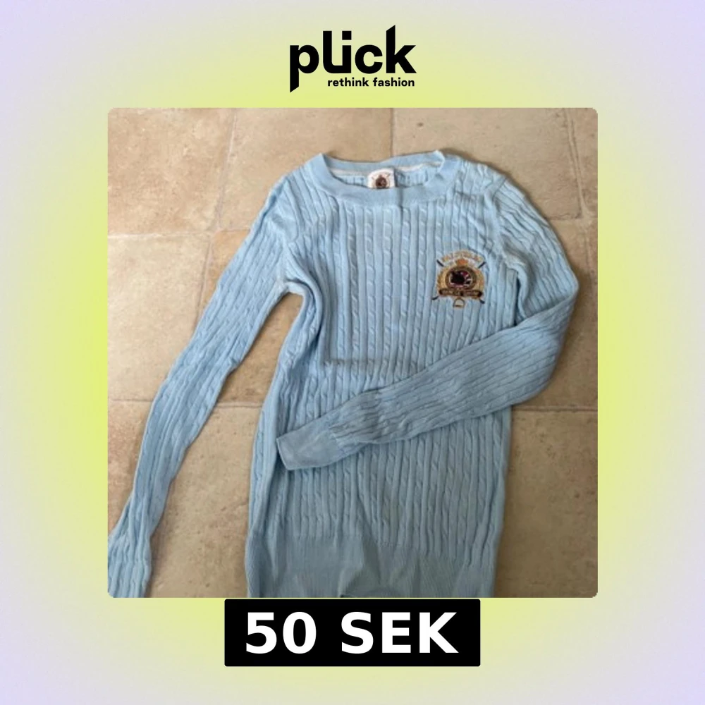 Kabelstickad ljusblå tröja från Gina Tricot med broderad Falsterbo Horse Show-logga på bröstet. Tröjan har rund halsringning och långa ärmar, ridinspirerade detaljer. endast en liten defekt, se bild