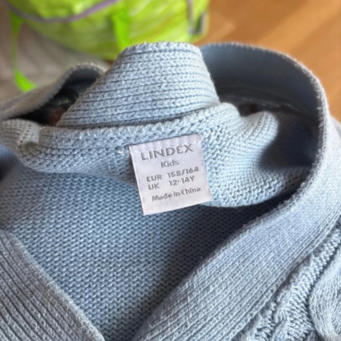 Jättesöt kofta från Lindex. Använd många gånger vilket syns. Som ni kan se på bild 3 så har ärmen gått upp lite men det går säkert att laga. Det är storlek 158/164.