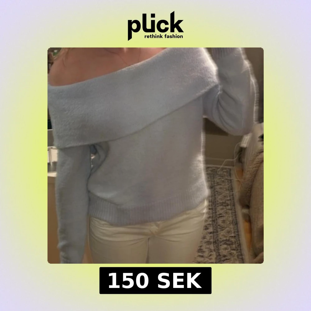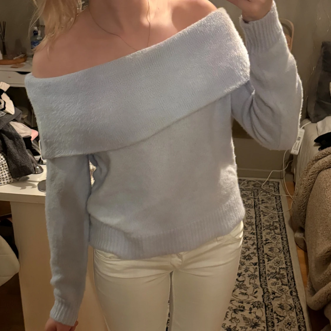 Superfin ljusblå stickad tröja från H&M med bred offshoulder-ringning. Mjuk och mysig känsla, perfekt för kyliga dagar. Långärmad och ribbade muddar vid ärmslut och nederkant. Snygg att styla med jeans eller kjol.