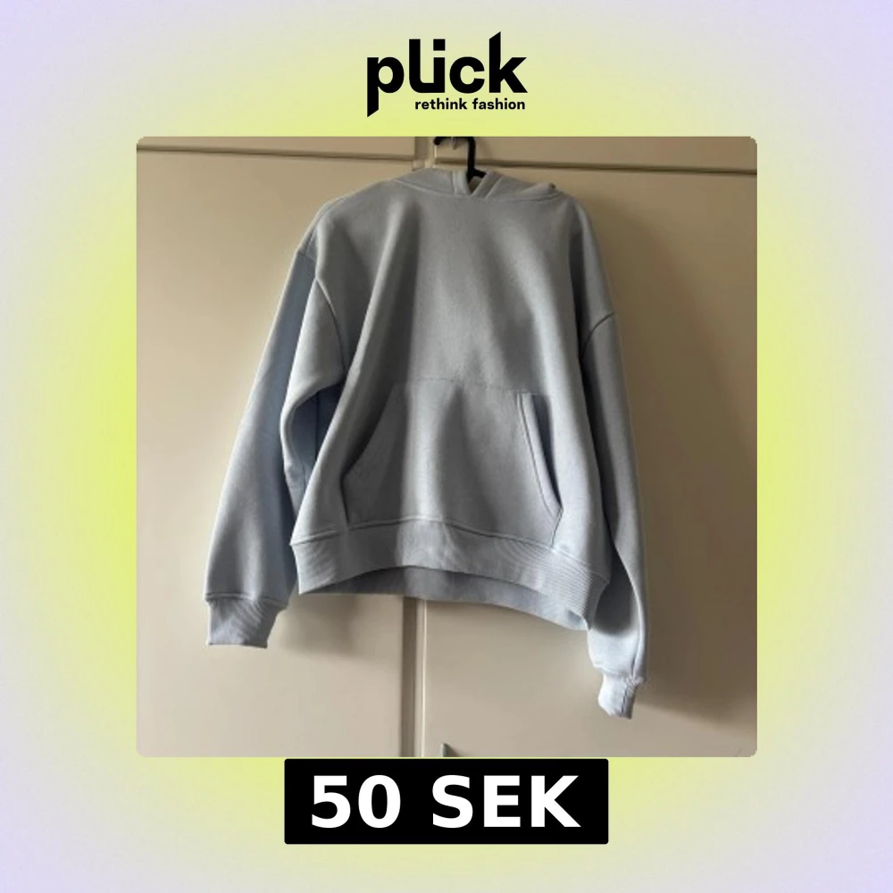 Säljer en ljusblå hoodie med oversized passform och stor känguruficka framtill. Tröjan har huva och breda muddar vid ärmslut och nederkant. Perfekt för dig som gillar en chill och avslappnad stil.oanvödn