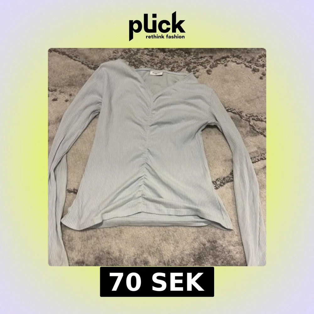Säljer en ljusblå långärmad topp från Kappahl med ribbad struktur och v-ringning. Toppen har en lätt rynkad detalj framtill och är i ett mjukt, stretchigt material. Perfekt för en stilren och enkel look.