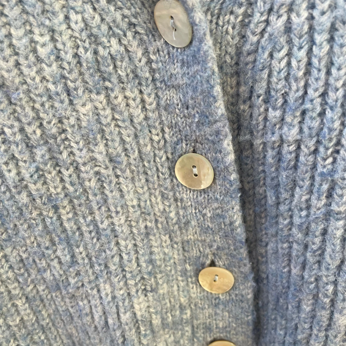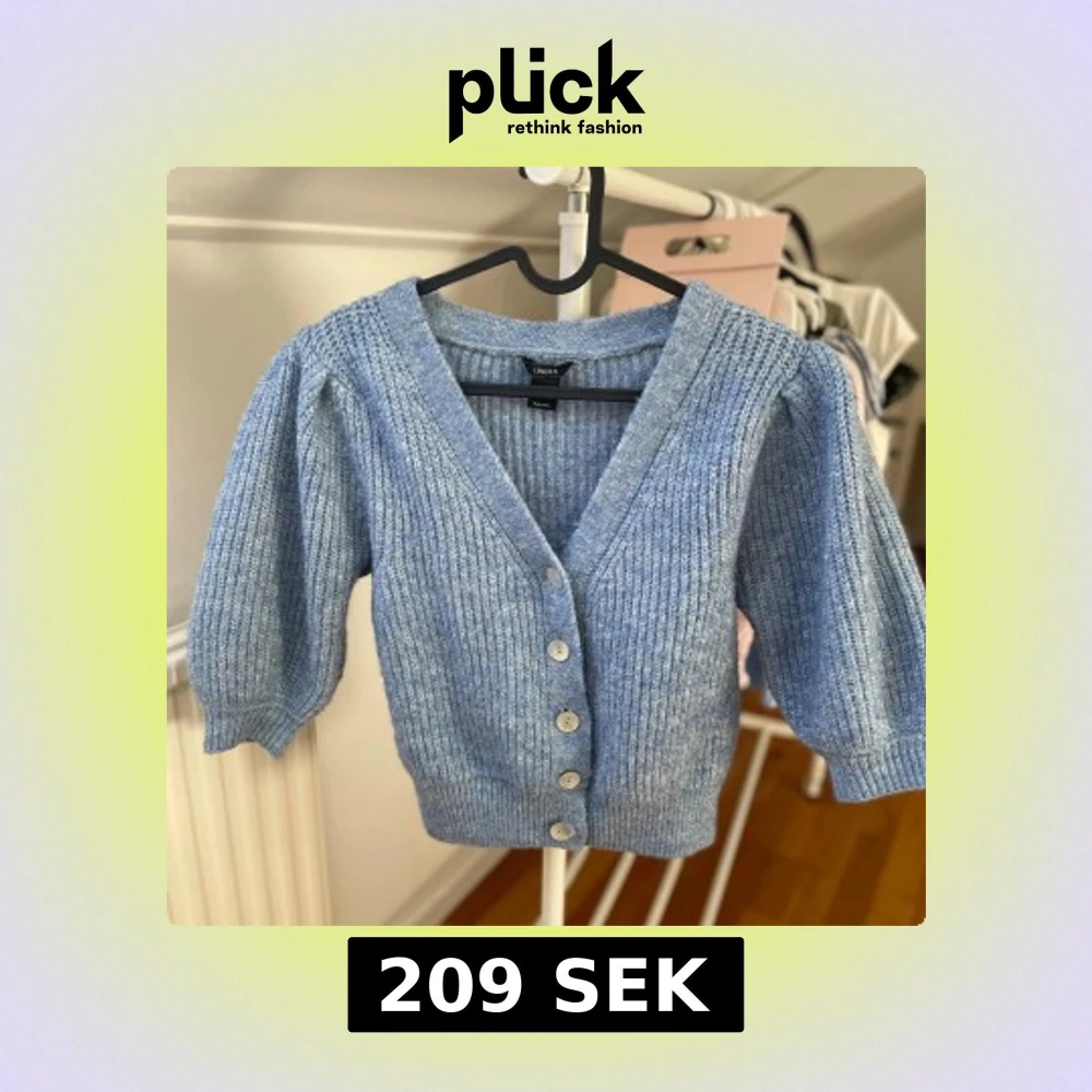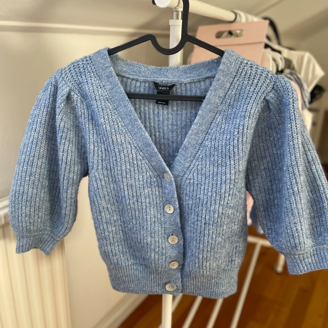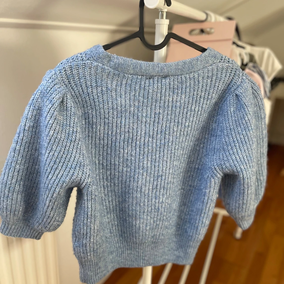 Superfin ljusblå stickad kofta från Lindex med v-ringning och snygga knappar framtill. Koftan har trekvartsärmar och ribbad struktur