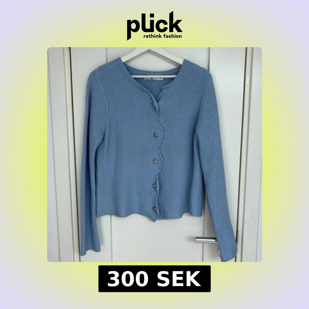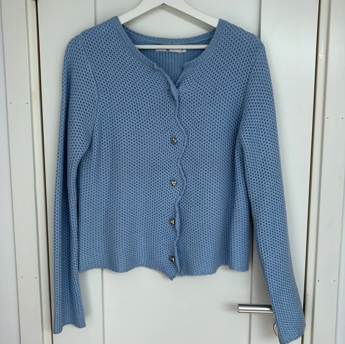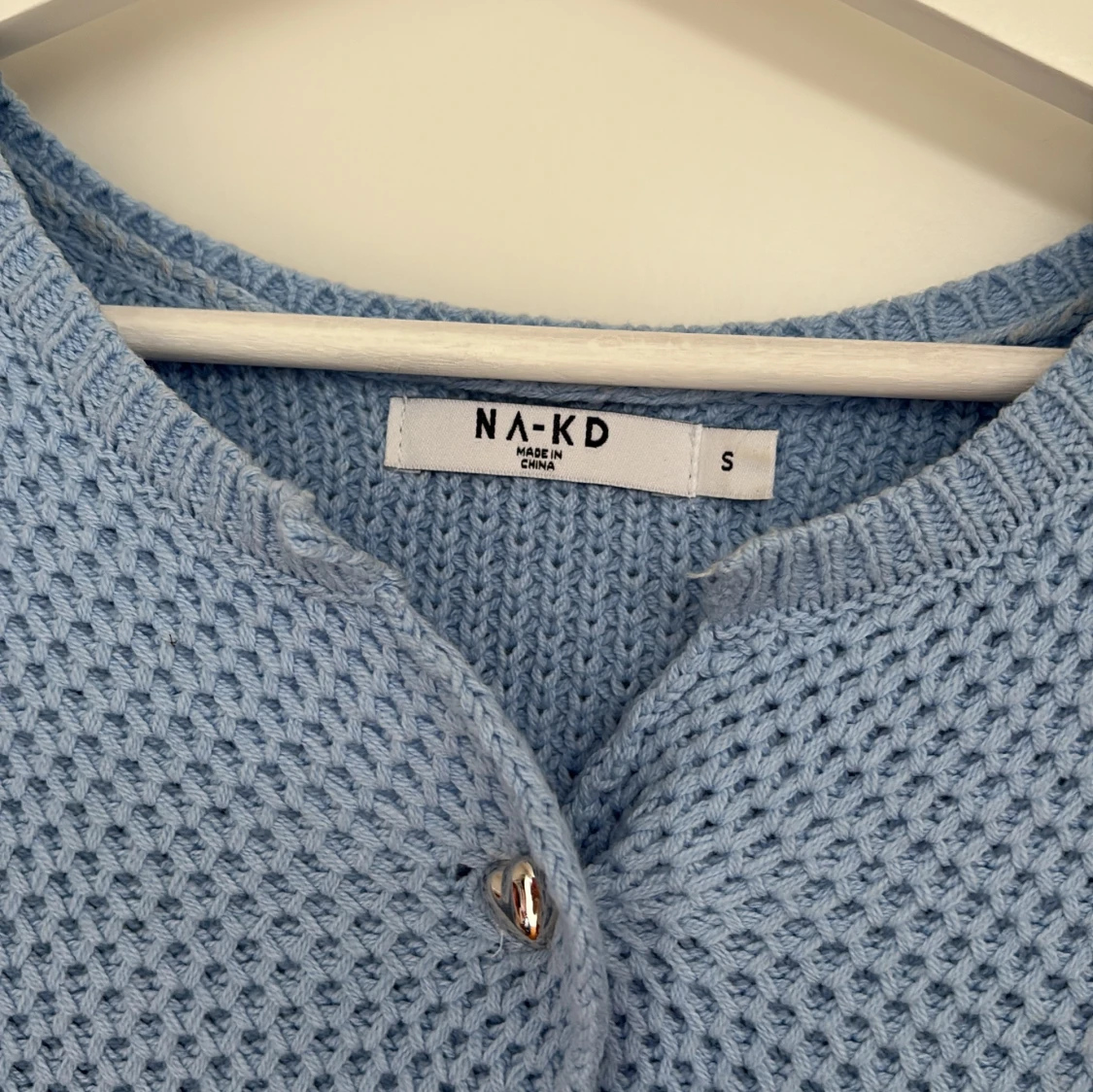 Superfin ljusblå stickad kofta från NA-KD med vågig kant och silvriga hjärtformade knappar. Koftan har lång ärm och är perfekt att slänga på sig över en topp. Mysig struktur och rund halsringning.